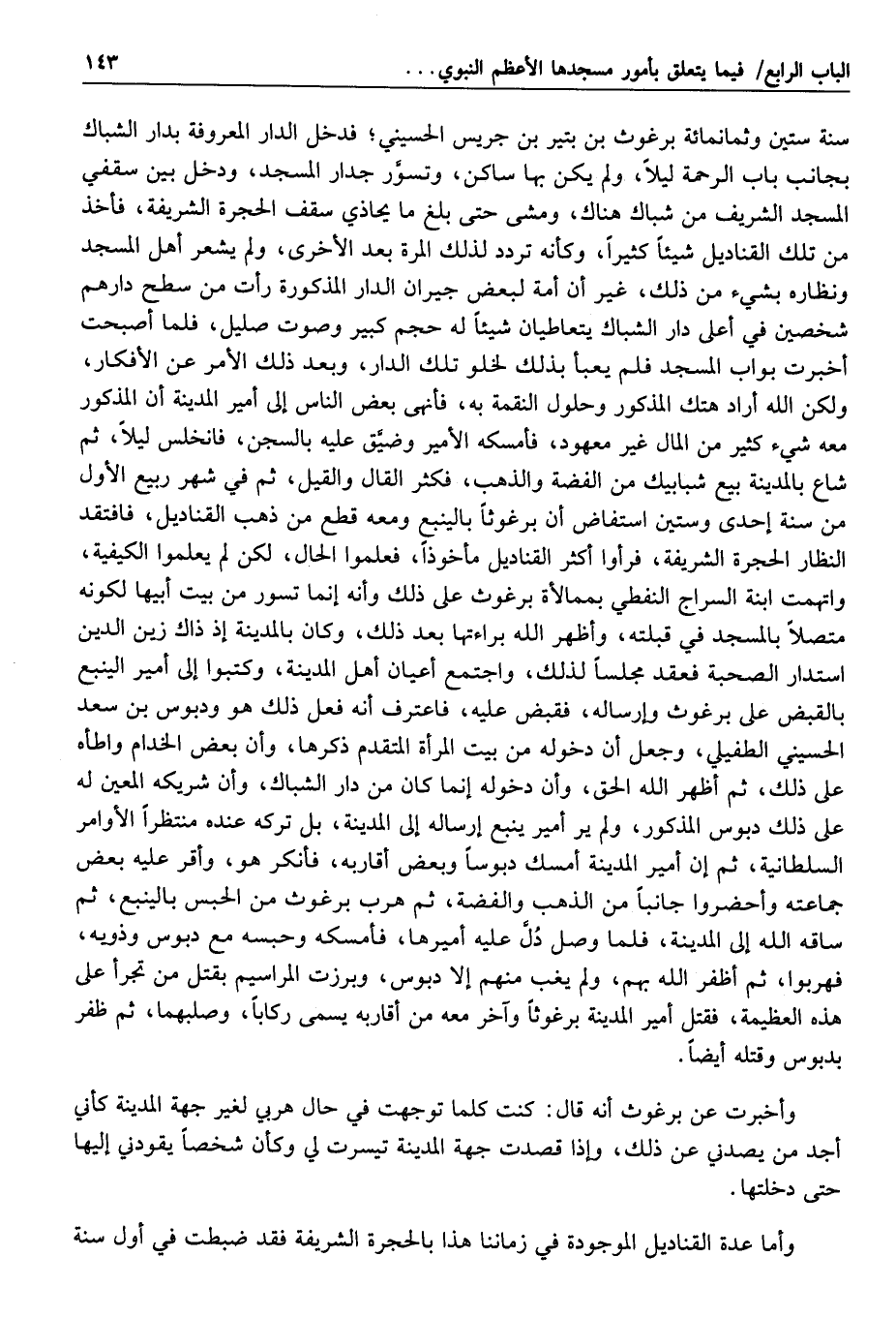 قلت: ورأيت بخط شيخنا العلامة ناصر الدين المراغي قائمة ذكر أنه نقلها من خط قاضي طيبة الزين عبد الرحمن بن صالح صورتها: الذي كان في القبة، وأخذه جماز بن هبة، هو من القناديل الفضة ثلاثة وعشرون قنطارا وثلث قنطار، غير الذي في الرفوف، والصندوقين الذهب، ثم ذكر تفصيل ذلك في ثمان عشرة وزنة، ثم كتب ما صورته: