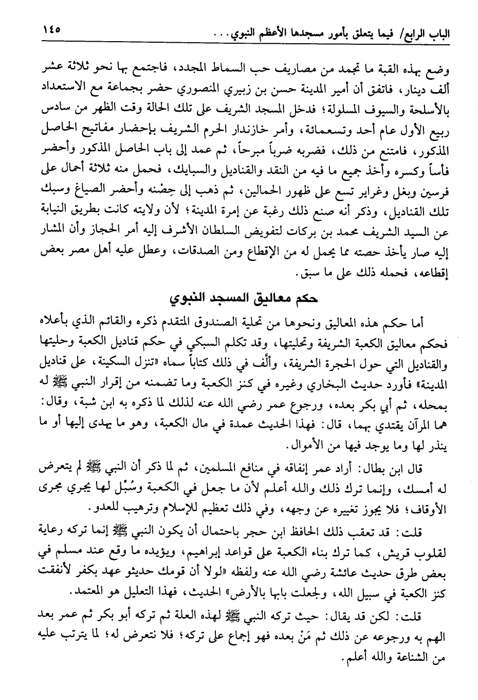 إحدى وثمانين وثمانمائة بأمر السلطان الأشرف لشيخ الحرم الأمير انيال والقضاي الزكوي؛ فكان عدة معاليق الذهب ثمانية عشر قنديلا وبعض قنديل، وأربع مشنات، ومغرافان، وسواران، وزنة ذلك سبعة آلاف قفلة وستمائة وخمسة وثلاثون، من ذلك قنديل كبير في جهة الوجه الشريف زنته أربعة آلاف وستمائة قفلة، أهداه سلطان الكلرجه شهاب الدين أحمد، وعدة معاليق الفظة ثلاثمائة قنديل وأربعة وأربعون قنديلا، وثرية كبيرة، زنة ذلك ستة وأربعون ألف وأربعمائة وخمسة وثلاثون قفلة، وكانت ضبطت قبل ذلك في سنة اثنتين وستين وثمانمائة على يد الأمير بردبك التاجي فتحرر من النظر بين المقدارين أن الزائد على ما ضبط في التاريخ المتقدم من الذهب ألف قفلة ومائة وخمسة وخمسون، ومن الفضة ثلاثة عشر ألف قفلة وسبعمائة وخمسة وثمانون قفلة، فذلك القدر هو الوارد من عام ثلاث وستين إلى آخر عام تسع وسبعين، وهناك من المعاليق أيضا غير ما تقدم قنديل من بلور بتابوت من فضة، وقناديل نحاس أربعة، وفولاذ واحد مكفّت بالذهب مشبك مكتوب عليه أن الناصر محمد بن قلاوون علقه من يده إلى عام حجه، ثم ورد في سنة ثمانين في مشيخة الشيخ انيال ولم يدخل في الجملة المتقدمة قنديلان من الذهب زنتهما مائة وخمسة وعشرون قفلة، ومن الفضة اثنان وثلاثون قنديلا زنتها ألف ومائتان وخمسة وسبعون قفلة، وفي سنة إحدى وثمانين قنديل ذهب زنته مائة واثنان وأربعون قفلة، وأربعة وعشرون قنديلا من الفضة زنتها تسعمائة وخمسون قفلة، وفي سنة اثنين وثمانين من الفضة أحد وثلاثون قنديلا زنتها ألف وخمسمائة وخمسون قفلة، ولم يرد شيء من الذهب، وفي سنة ثلاث وثمانين من الذهب قنديل واحد زنته عشرون قفلة، ومن الفضة خمسة وعشرون قنديلا زنتها ألف ومائة وخمسة وثلاثون قفلة، وفي سنة أربع وثمانين من الفضة تسعة عشر قنديلا زنتها سبعمائة وخمسة وأربعون قفلة، ولم يرد شيء من الذهب؛ فجملة ما ورد في ولاية الأمير انيال في المدة المذكورة من الذهب أربعة قناديل جملة زنتها مائتان وسبعة وثمانون قفلة، ومن الفضة مائة قنديل وتسعة وعشرون قنديلا جملة زنتها خمسة آلاف وستمائة وخمسة وخمسون قفلة، ولما شرعوا في عمارة الحجرة الشريفة الآتي ذكرها في سنة إحدى وثمانين وثمانمائة رفعوا جمع المعاليق التي كانت حولها، ووضعت بالقبة التي بصحن المسجد بأمر متولي العمارة الجناب الشمسي، ولم يزل بها إلى تاريخه، ولم يكن اليوم حول الحجرة الشريفة من المعاليق إلا ما تجدد في آخر سنة إحدى وثمانين إلى آخر سنة أربع وثمانين، ثم حسّن متولي العمارة للسلطان صرف ذلك في مصالح المسجد والمدينة الشريفة، فحمل بعضه من الحاصل المذكور إلى مصر قبيل الحريق الثاني، ثم وجدوا ما سقط لسبب الحريق من القناديل التي كانت معلقة بحالها، ثم صرف متولي العمارة بعض ذلك في تذهيب السقف المعادة بعد الحريق، ثم