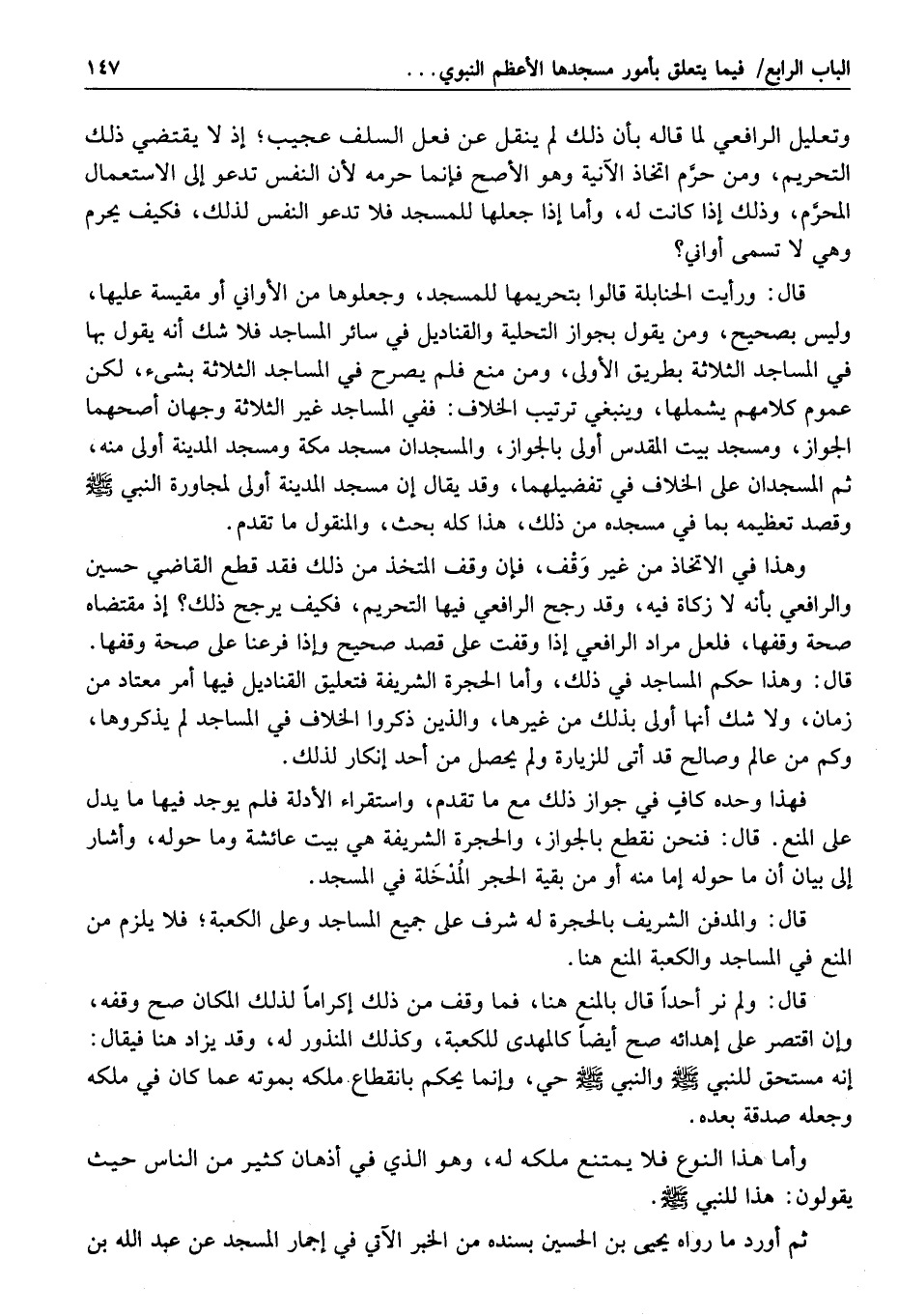 ثم نقل السبكي عن الرافعي أنه قال: لا يجوز تحلية الكعبة بالذهب والفضة وتعليق قناديلها. ثم نقل أن في تحلية الكعبة والمساجد بالذهب والفضة وتعليق قناديلها وجهين مرويين في الحاوي وغيره: أحدهما: الجواز، تعظيما كما في المصحف، وكما يجوز ستر الكعبة بالديباج، وأظهرهما المنع؛ إذ لم ينقل ذلك عن فعل السلف، ثم استشكل كلام الرافعي فقال: وأما التسوية بين الكعبة والمساجد فلا ينبغي؛ لأن للكعبة من التعظيم ما ليس للمساجد، بدليل جواز سترها بالحرير إجماعا، وفي ستر المساجد به خلاف، فحكاية الخلاف فيها مشكل، وترجيح المنع أشكل، وكيف وقد فعل ذلك في صدر هذه الأمة، وقد تولى عمر بن عبد العزيز عمارة مسجد رسول الله صلّى الله عليه وسلّم عن الوليد وذهّب سقفه بأمره من غير مراجعة، بل لما ولي الخلافة بعد ذلك أراد أن يزيل ما في جامع بني أمية من الذهب فقيل له: إنه لا يتحصل منه شيء يقوم بأجرة حكّه، فتركه. والصفائح التي على الكعبة يتحصّل منها شيء كثير، فلو كان فعلها حراما لأزالها في خلافته، فلما تركها ومعه جميع من يحج كل عام وجب القطع بجوازها، وهذا في تحلية الكعبة بالصفائح، ولا منع من جريان الخلاف في التمويه لإزالة المالية، ولا من إجراء الخلاف في سائر المساجد تمويها وتحلية، على أن القاضي حسين جزم بحل تحلية المسجد بالقناديل من الذهب ونحوها، وأن حكمها حكم الحلي المباح، وهذا أرجح مما قال الرافعي؛ لأنه ليس على تحريمهما دليل، والحرام من الذهب إنما هو استعمال الذكور له، والأكل والشرب ونحوهما، وليس في تحلية المسجد بالقناديل ونحوها شيء من ذلك، لكن لا أقول إنه ينتهي إلى حد القربة في سائر المساجد،