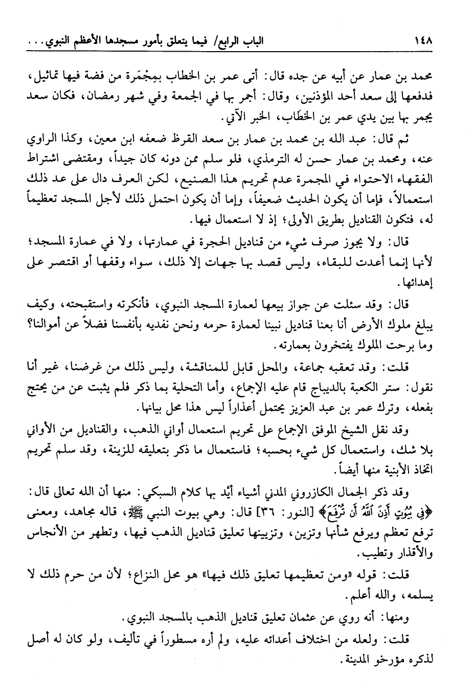 قال: وهذا حكم المساجد في ذلك، وأما الحجرة الشريفة فتعليق القناديل فيها أمر معتاد من زمان، ولا شك أنها أولى بذلك من غيرها، والذين ذكروا الخلاف في المساجد لم يذكروها، وكم من عالم وصالح قد أتى للزيارة ولم يحصل من أحد إنكار لذلك.