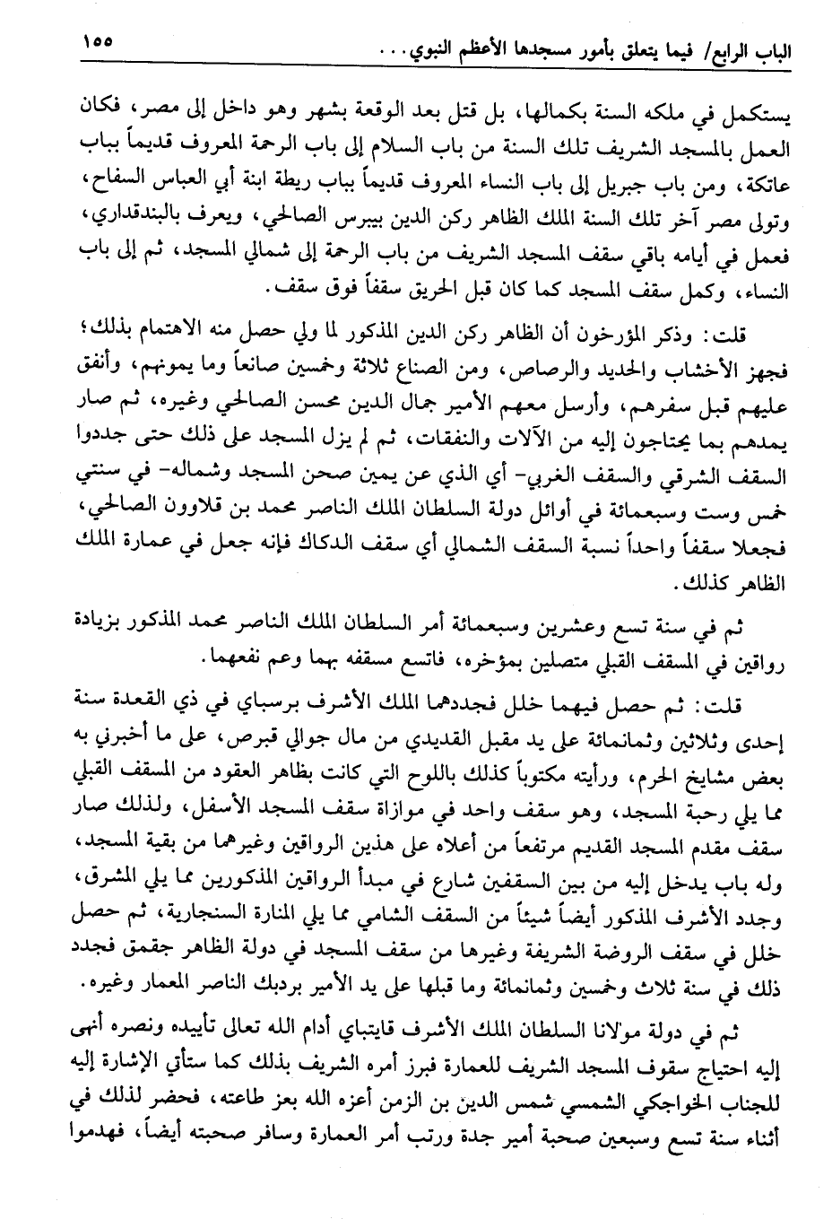 ولنرجع إلى ما ذكره عقب ما تقدم عنه، قال: وسقفوا في هذه السنة- وهي سنة خمس وخمسين- الحجرة الشريفة وما حولها إلى الحائط القبلي وإلى الحائط الشرقي إلى باب جبريل عليه السلام المعروف قديما بباب عثمان، ومن جهة المغرب الروضة الشريفة جميعها إلى المنبر الشريف.