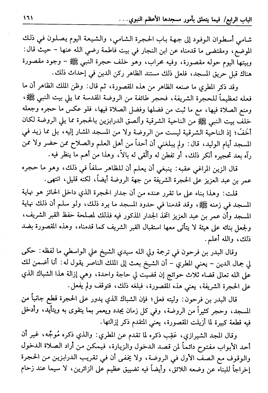 وفي كلام البدر ابن فرحون ما يقتضي أنه كان ثمّ مقصورة متصلة بهذه المقصورة من جهة المغرب، ثم أزيلت، ولفظه: وقد تساهل من كان قبلنا فزادوا على الحجرة الشريفة مقصورة كبيرة عملت وقاية من الشمس إذا غربت، وكانت بدعة وضلالة تصلي فيها الشيعة؛ لأنها قطعت الصفوف، واتّسمت بمن ذكر من الصنوف، وندم على ذلك واضعها، ولقد كنت أسمع بعضهم يقف على بابها ويؤذن بأعلى صوته «حي على خير العمل» وكانت مواطن تدريسهم، وخلوة علمائهم حتى قيّض الله لها من سعى فيها فأصبحت ليلة منخلعة أبوابها، مقوسة أخشابها، متصلة صفوفها، وأدخل بعضها في الحجرة الشريفة- يعني ما اشتمل عليه الدرابزين المذكور- وجعل فيها الباب الشامي، وكان ذلك مع زيادة الرواقين اللذين زادهما الملك الناصر، انتهى.