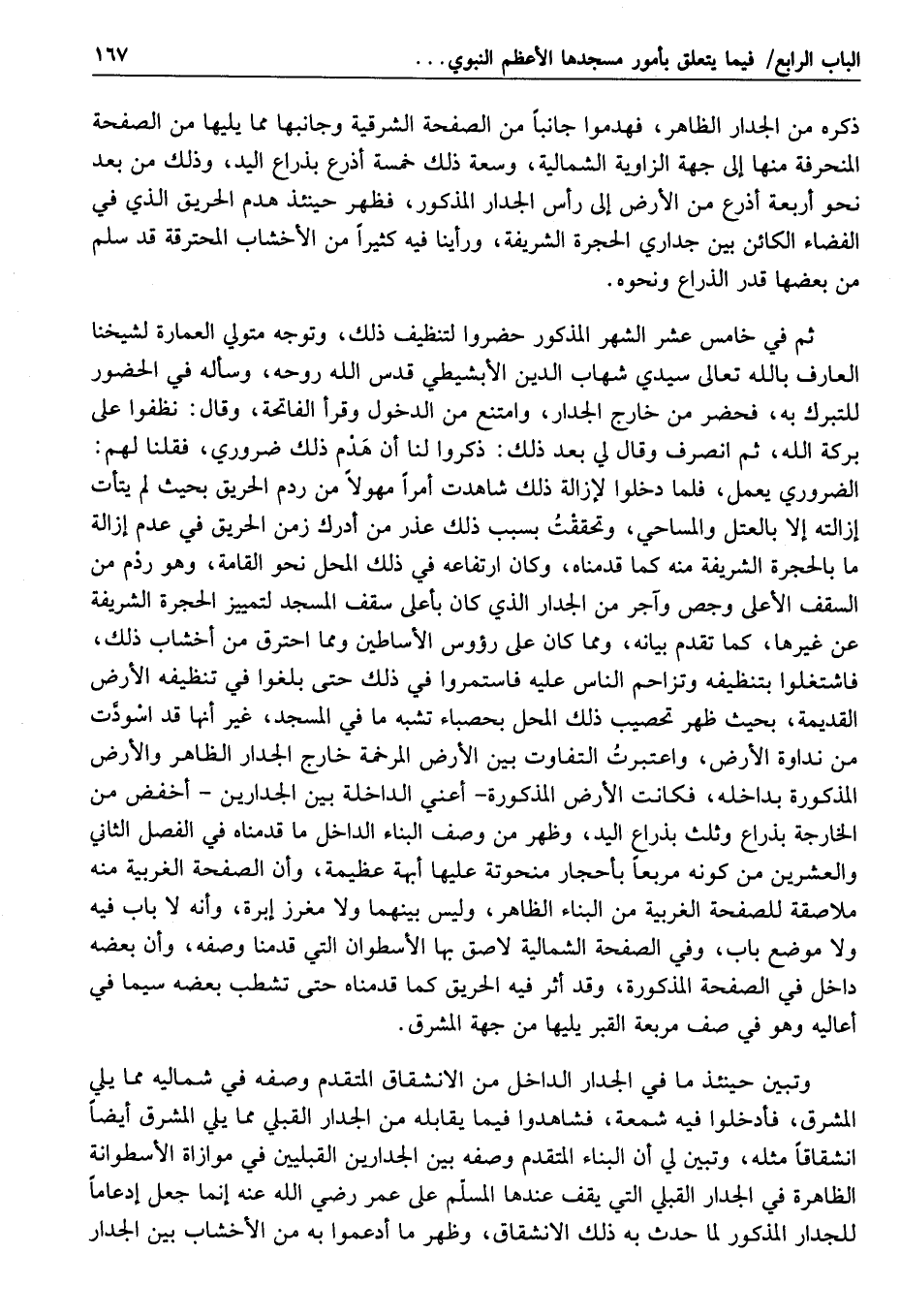 فلما كان عشية السبت ثالث عشر شعبان عقدوا مجلسا في جوف المقصورة عند الجدار المذكور، حضره القضاة والمشايخ والخدام وشيخهم الأمير إينال، وطلبوني لذلك المجلس، فترددت في الحضور لما قدمته، ثم توضأت وصليت صلاة الاستخارة وسألت الله أن يلهمني السداد والصواب، وحضرت فوجدت الأمر قد اتفق عليه، وشاهدت ما قدمته من وصف ذلك، ورأيت على ذلك البناء الداخل من الهيبة والأنس ما لا يوصف ولا يدرك إلا بالذوق، وتحرر لي أن سبب انشقاق الجدار الظاهر انشقاق الجدار الداخل وميلانه نحو الجدار الظاهر وكأن الأقدمين لما رأوا انشقاق الجدار الداخل- ولعل رؤيتهم لذلك والله أعلم عقب الحريق عندما أحدثوا السقف المتقدم وصفه على الحجرة الشريفة- أدعموا الجدار الداخل بأخشاب جعلوها بين الجدار الداخل والخارج عند رأسهما في شرقي الحجرة، فمال الجدار الظاهر من أعلاه بحيث صار أعلاه لا يوازي أسفله، وخرج بسبب ذلك عن الاستقامة، فحدث فيه الشق المذكور، ورأيت الحاضرين بين ساكت ومشير، فترجح عندي سلوك رأي ابن عباس رضي الله عنهما في أمر الكعبة، حيث أشار بترميمها فقط، ورأيت أن ما يطلب هنا من الأدب أوجب مما يطلب هناك، فحاولت إدعام البناء الظاهر ببناء، فلم أوافق عليه، فسألت مهندس العمارة- وكان أعرف الحاضرين بهذا الأمر- هل تحققت الآن إشراف هذا الجدار على السقوط وأنه لا يتأتى تأخيره، أم يحتمل التأخير مدة إذا رمّ بالجص والآجر كما كان أوّلا فيؤخر إلى أن يصير غير محتمل للتأخير؛ فإنه لا يفعل هنا إلا ما تدعو إليه الضرورة في الحال؟ فقال: الترميم شيء وقطع الفرط شيء آخر، ثم سأل متولي العمارة عن كيفية ما يكتب ليطالع به المسامع الشريفة، فقال له القاضي الزكوي قاضي الشافعية وأحد الناظرين سامحه الله تعالى: سرّح العمال غدا للهدم وكتابة المحضر علينا، وخافت متولي العمارة بالإنكار عليه في إحضاري، وحثّه على الإعراض عن كلامي.