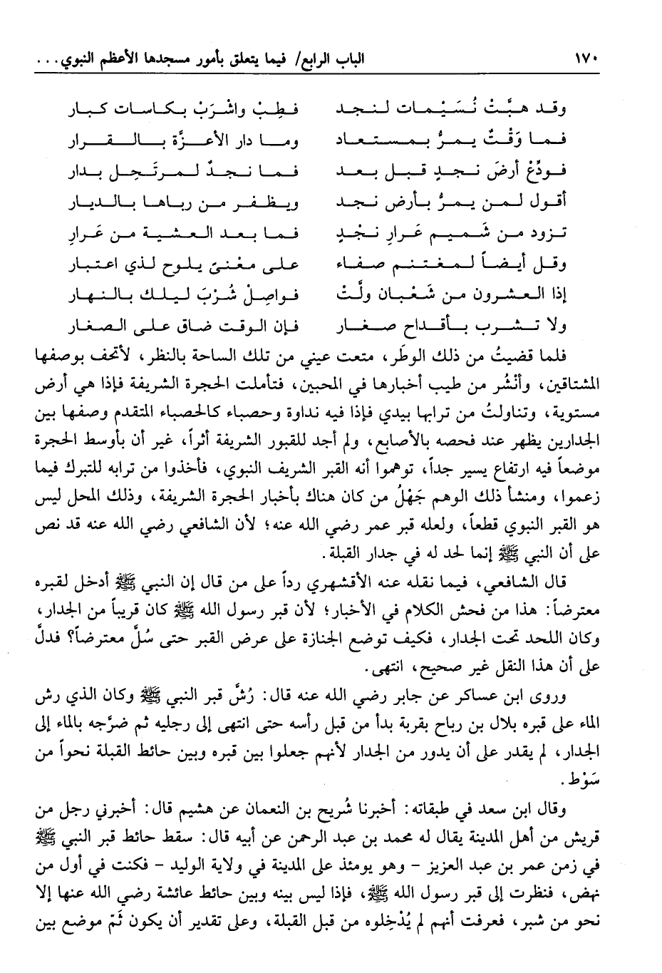 الشريفة، وذلك في صبيحة الثالث والعشرين من شعبان المذكور، ومكثوا في ذلك إلى غروب الشمس مع كثرتهم حتى بلغني أن الحجرة الشريفة امتلأت بهم، ولم يخصوا مكانا دون مكان، فظنوا أن القبر الشريف النبوي قريبا من وسط الحجرة، وليس كذلك كما سنبينه، ووضعوا ما أخرجوه من الردم عند طرف المسقف الغربي في زاويته المتصلة بمسقف الدكاك، وبنى عليه متولي العمارة تلك الدكة البارزة هناك. ثم وفّى القضاي الزكوي بما وعد به متولي العمارة من كتابة المحضر، وكتب فيه أهل المدينة، ولم أكتب فيه، واعتذرت بأنه لم يسبق لي عادة بمثل ذلك، وبعثوا به إلى مصر المحروسة، فلما كان في صبيحة الخامس والعشرين من الشهر المذكور بعث إليّ متولي العمارة لأتبرك بمشاهدة الحجرة الشريفة بعد تنظيفها، وصار قائل يقول: ظهر القبر الشريف، وقائل يقول: لم يجدوا لجميع القبور الشريفة أثرا، فحثّني داعي الشوق وغلبة الوجد، واستحضرت ما وقع لبعض السلف من سؤاله لعائشة رضي الله عنها أن تريه القبور الشريفة، وغير ذلك مما سبق ومما سيأتي في باب الزيارة، ووصف السلف للقبور الشريفة، وذكرهم ذرع الحجرة الشريفة وكيفيتهما كما تقدم، فعزمت على الإقدام، وتمثلت بقول بعضهم: