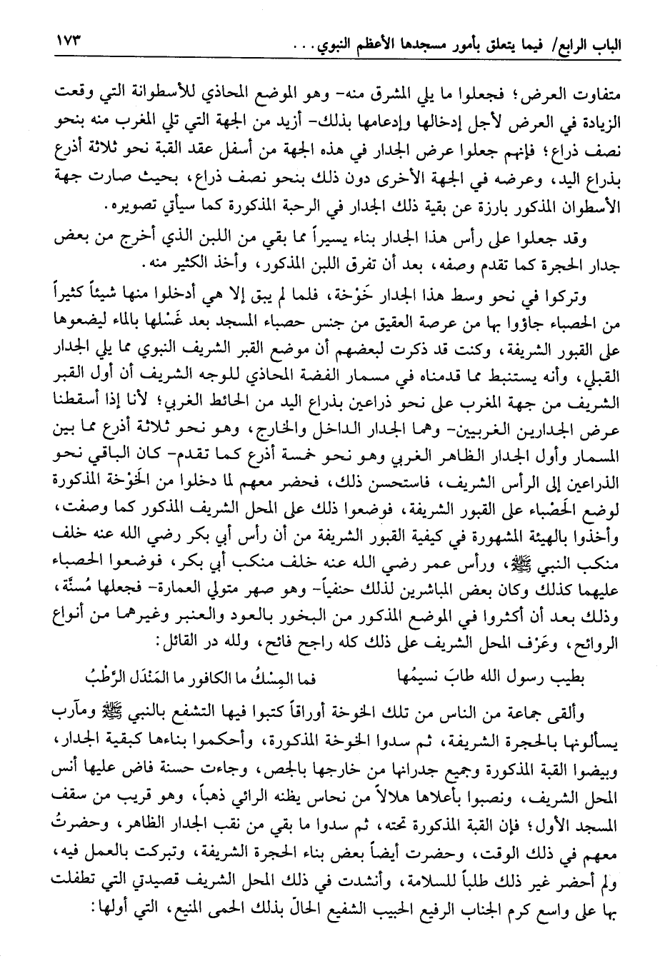 المتقدم وصفها بين الجدارين، وكان الشروع في إعادة بناء الحجرة في سابع عشر شعبان المذكور، فابتدؤوا بالجدار المذكور، وأوصلوه بالجدار الغربي، وأعادوا ذلك بأحجار الحجرة التي نقضوها منها، ثم رأوا أن إحكام القبة التي عزموا عليها يقتضي تربيع محلها، بحيث لا يزيد طوله على عرضه. وقد قدمنا في ذرع الحجرة ما يقتضي عدم ذلك، فعقدوا قبوا على نحو ثلث الحجرة الذي يلي المشرق والأرجل الشريفة، وجعلوا الجدار الخارج من جهة المشرق متصلا بجدار الحجرة الداخل، فأدخلوا ما كان بينهما في جدار القبو المذكور إلى نهاية ارتفاعه، وكذا فعلوا فيما كان بين الجدار القبلي الداخل والخارج، سدّوه أيضا بالبناء حتى لم يبق حول البناء الداخل فضاء إلا ما بقي من الرحبة المثلاثة الشكل في جهة الشام وصار علو القبة المذكور فضاء أيضا بين القبة وبين الجدار الظاهر في جهة المشرق وعقدوا القبة المذكورة على ما بقي من الحجرة، وهو ما يلي المغرب منها في جهة الرؤوس الشريفة، وحاول بعض الناس أن يكون عقد القبة بالآجر، فكرهت ذلك لما لا يخفى، فاجتنبه متولي العمارة جزاه الله تعالى خيرا، وعقدها بالأحجار المنحوتة من الحجر الأسود، وكملها بالأبيض، وأخبروني أن ارتفاع القبة المذكورة من داخل أرض الحجرة الشريفة إلى محدّب القبة المذكورة- وهو أعلاها المغروز فيه هلالها- اثنا عشر ذراعا بذراع العمل؛ فيكون بالذراع المتقدم وصفه ثمانية عشر ذراعا وربع ذراع.