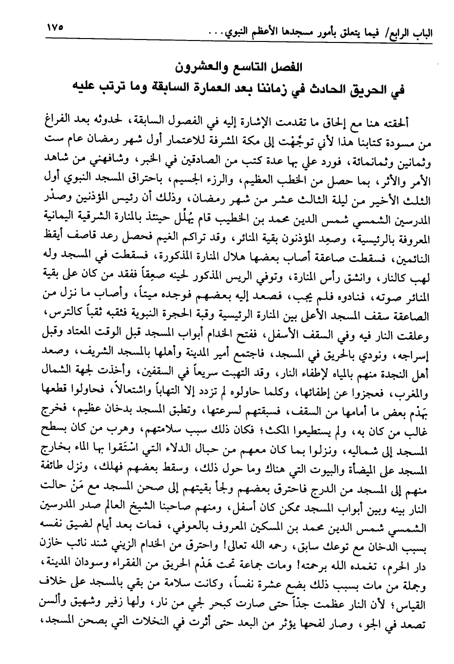 وكان الفراغ من ذلك وختم بناء الجدار الظاهر في يوم الخميس المبارك سابع شوال من السنة المذكورة، وأصرفوا في ذلك وفي غيره من عمارات المسجد وإعادة منارة مسجد قباء وتجديد بعض سقفه وإحكام مصرف المياه التي كانت تجتمع حول المسجد عند كثرة الأمطار مالا جزيلا، ومن أعظم ذلك نفعا ما جعل لمصرف المياه المذكورة كما سيأتي وصفه فقد عم نفعه، وذلك كله في الصحائف الشريفة السلطانية الأشرفية، أعز الله أنصارها، وأعلى في سلوك العدل منارها، على يد متولي العمارة الجناب الشمسي المتقدم ذكره ضاعف الله تعالى حسناته.