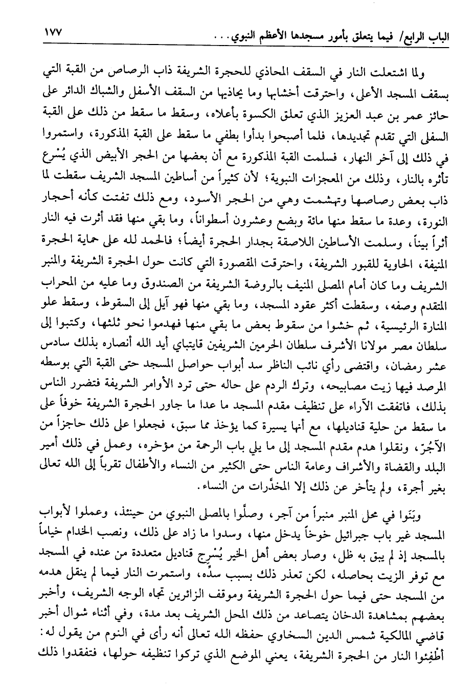 هذا ما حصل لأهل المدينة الشريفة من الدهشة العظيمة والحيرة لما شاهدوا من هول هذه النار ومنظرها الفظيع، حتى أيقن بعضهم بالهلاك، وانتقل بعض أهل الدور منها لما وصل إليهم الشرر، وخرج بعضهم من باب المدينة الذي يلي البقيع، وبعضهم من بابها الذي يلي المصلى، وظنوا أن النار محيطة بهم. قال الشمس العثماني: وصار لجميع المدينة من جميع جهاتها بالبكاء ضجيج، وبالدعاء عجيج، قال: وأمر هذه النار عجيب، وليس الخبر كالمعاينة، وصار المسجد كالتنور، ولم يمض إلا أقل من عشر درج وقد استولى الحريق على جميع سقف المسجد وحواصله وأبوابه وما فيه من خزائن الكتب والربعات والمصاحف، غير ما وقعت المبادرة لإخراجه أولا وهو يسير، وغير القبة التي بصحن المسجد، وسبق ذكر سلامتها في الحريق الأول، وكنت تركت كتبي بالخلوة التي كنت أقيم بها في مؤخر المسجد، فكتب إلّي باحتراقها، ومنها أصل هذا التأليف وغيره من التاليف والكتب النفيسة نحو ثلاث مائة مجلد، فمنّ الله تعالى عليّ ببرد الرضى والتسليم، وفراغ القلب عن ذلك، حتى ترجحت هذه النعمة عندي على نعمة تلك الكتب لما كنت أجده قبل من التعلق بها؛ فلله الحمد والشكر على ذلك. هذا، مع ما منّ الله به علي من غيبتي عن هذا الأمر المهول؛ فإن وقوعه كان في ليلة الوصول إلى الحرم المكي، ولم يتفق لي منذ سكنت المدينة الخروج منها في رمضان، بل كنت ألازم المسجد النبوي فيه من أوله إلى آخره ليلا ونهارا، فكان ذلك سبب النجاة من هذا الأمر.