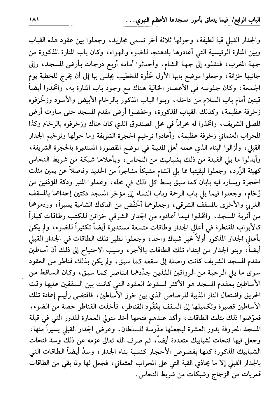 باب الرحمة، وأعادوا المنارة الرئيسية وسور المسجد المذكور، وزادوا في عرضه يسيرا، ووسعوا المحراب العثماني، وسقفوا مقدم المسجد سقفا واحدا، بعد أن قصروا أساطينه وجعلوا عليها عقودا من الآجر فوقها أخشاب السقف، وكانت الأساطين المذكورة قبل ذلك واصلة إلى سقف المسجد كهيئة ما بقي من أساطينه في بقية المشرق والمغرب والشام، وجعلوا على المحراب العثماني قبة على رؤوس الأساطين، بعد أن قرنوا إلى كل أسطوانة ثانية، وجمعوا في بعضها بين خمس أساطين؛ ليتأتى لهم عقد القبة المذكورة، وأزالوا الأسطوانة التي كانت في محاذاة الأسطوانة التي إليها المصلّى النبوي بينها وبين المحراب العثماني، وجعلوا على ما يحاذي الحجرة الشريفة وما حوله قبة عظيمة على دعائم بأرض المسجد وعقودا من الآجر بدلا عن القبة الزرقاء التي كانت قبل الحريق، وكانت تلك على رؤوس السواري كما سبق في الفصل السابع والعشرين، وقدمنا هناك ما حصل من ضيق المسجد من جهة المشرق بسبب ابتناء بعض تلك الدعائم هناك، فخرجوا بجدار المسجد الشرقي- أعني ما حاذى ذلك منه- بنحو عرض الجدار في البلاط الشرقي، وأبقوا الباب المعروف بباب جبريل في محله.