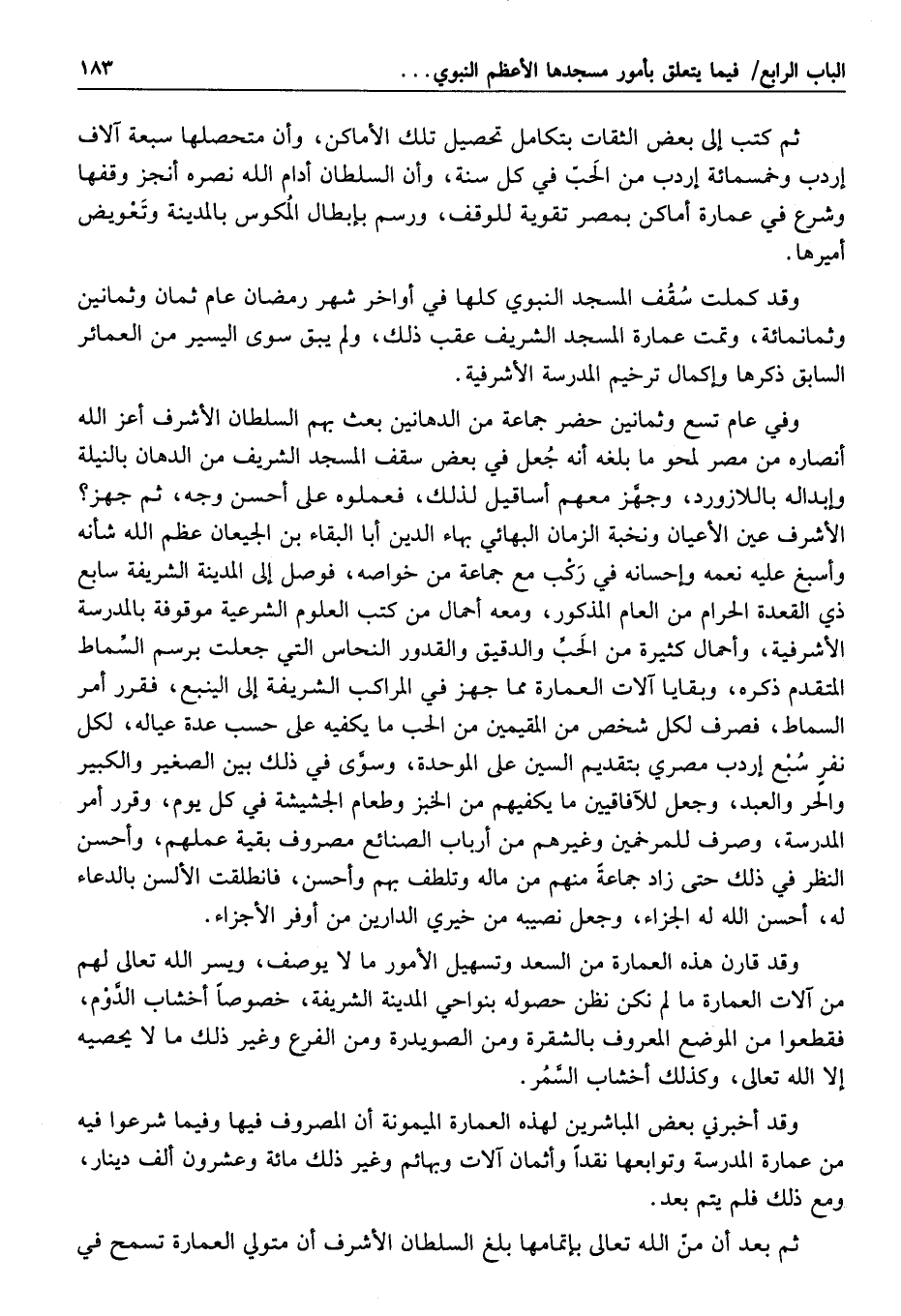 ولما قارب المسجد التمام أخذوا في عمارة الرباط والمدرسة المذكورين، وأسسوا لهما منارة في ناحيتهما التي تلي باب الرحمة، وشرعوا أيضا في عمارة رباط آخر بدل رباط الحصن العتيق، وفي حمام قبالة الرباط المذكور استأجروا أرض الحمام من الناظر على الميضأة التي بباب السلام فإنها منها، وشرعوا أيضا في عمارة سبيل وفرن وطاحون ومطبخ للدشيشة ووكالة ذات حواصل في الدور التي اشتروها قبل ذلك للسلطان من دور العباس وما يلي ذلك في جهة القبلة، وذلك أن السلطان أعز الله تعالى أنصاره بعد رجوعه من الحج شرع في شراء أماكن وجعلها وقفا ليحمل ريعها إلى المدينة الشريفة ليفرّق منه على أهلها ويعمل منه سماط كسماط الخليل عليه السلام، وأبرز لذلك ستين ألف دينار كما ذكرناه في الفصل الثالث والثلاثين، فاتخذوا هذه الأماكن لذلك، وهو أمر لم يسبق إليه، فسح الله تعالى في أجله، وبلغه من الخير غاية سؤاله وأمله، ولم يكن بالمدينة الشريفة حمام قبل ذلك من مدة مديدة، وكذا الطاحون، وإنما يستعملون الأرحاء التي تدار بالأيدي.