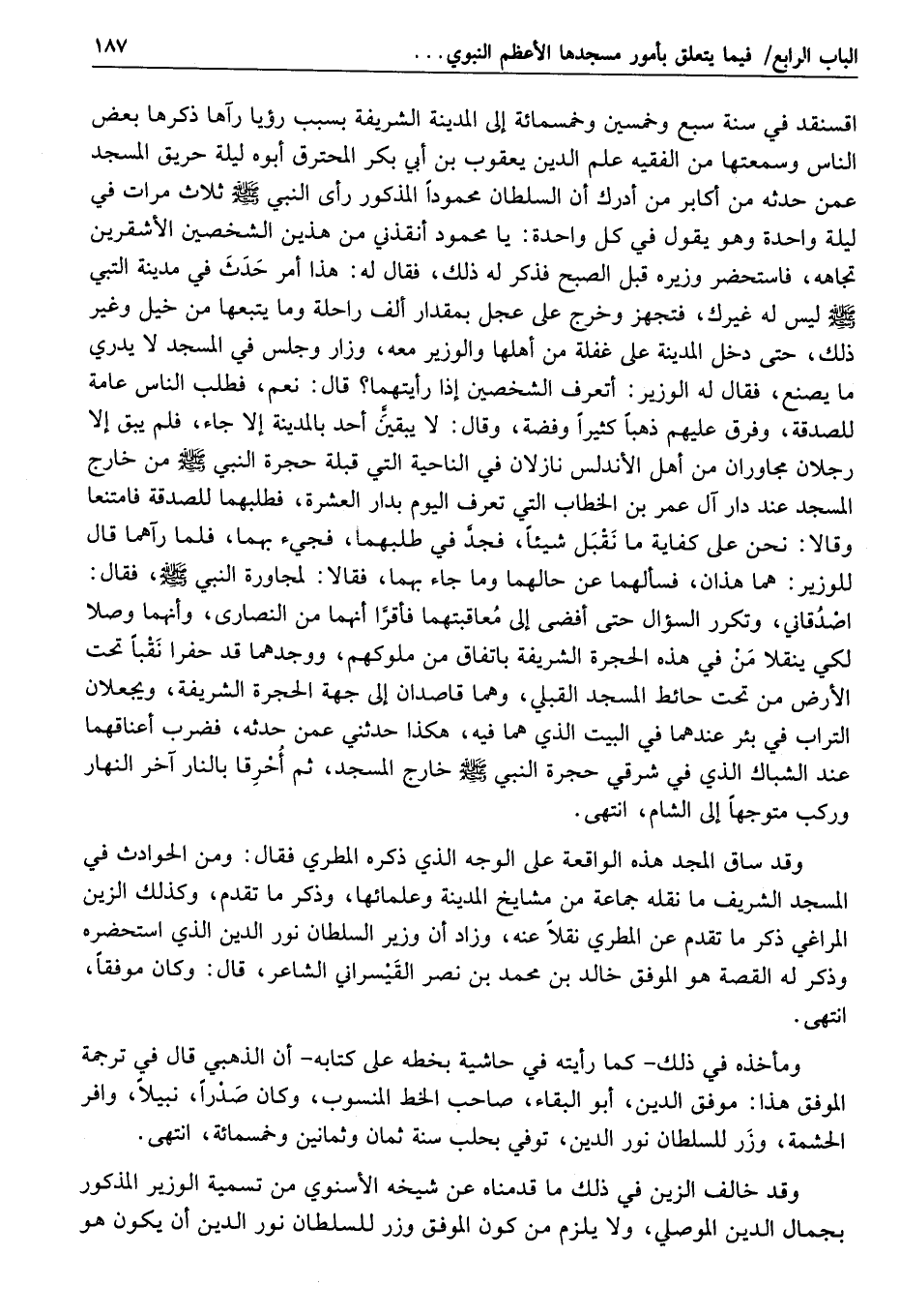 فيعطيه ويأمره بالانصراف، إلى أن انقضت الناس، فقال السلطان: هل بقي أحد لم يأخذ شيئا من الصدقة؟ قالوا: لا، فقال: تفكروا وتأملوا، فقالوا: لم يبق أحد إلا رجلين مغربيين لا يتناولان من أحد شيئا، وهما صالحان غنيان يكثران الصدقة على المحاويج، فانشرح صدره وقال: علّي بهما، فأتي بهما فرآهما الرجلين اللذين أشار النبي صلّى الله عليه وسلّم إليهما بقوله: أنجدني، أنقذني من هذين، فقال لهما: من أين أنتما؟ فقالا: من بلاد المغرب، جئنا حاجّين فاخترنا المجاورة في هذا العام عند رسول الله صلّى الله عليه وسلّم، فقال: اصدقاني، فصمّما على ذلك، فقال: أين منزلهما؟ فأخبر بأنهما في رباط بقرب الحجرة الشريفة، فأمسكما وحضر إلى منزلهما، فرأى فيه مالا كثيرا وختمتين وكتبا في الرقائق، ولم ير فيه شيئا غير ذلك، فأثنى عليهما أهل المدينة بخير كثير وقالوا: إنهما صائمان الدهر ملازمان الصلوات في الروضة الشريفة وزيارة النبي صلّى الله عليه وسلّم وزيارة البقيع كل يوم بكرة وزيارة قباء كل سبت، ولا يردان سائلا قط بحيث سدّا خلة أهل المدينة في هذا العام المجدب، فقال السلطان: سبحان الله! ولم يظهر شيئا مما رآه، وبقي السلطان يطوف في البيت بنفسه، فرفع حصيرا في البيت، فرأى سردابا محفورا ينتهي إلى صوب الحجرة الشريفة، فارتاعت الناس لذلك، وقال السلطان عند ذلك: