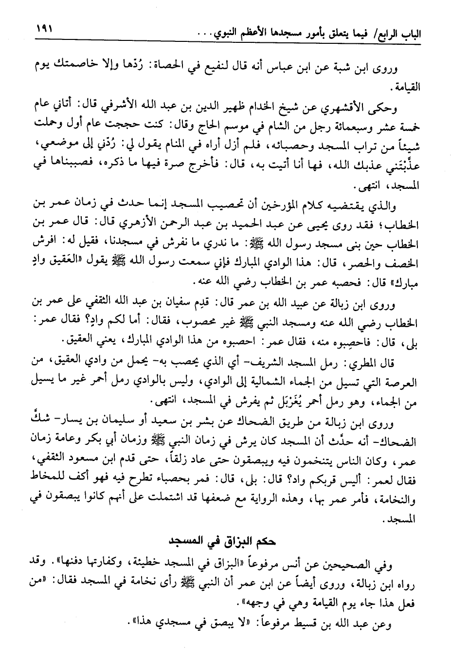 الفصل الثلاثون في تحصيب المسجد الشريف وذكر البزاق فيه، وتخليقه، وإجماره، وذكر شيء من أحكامه