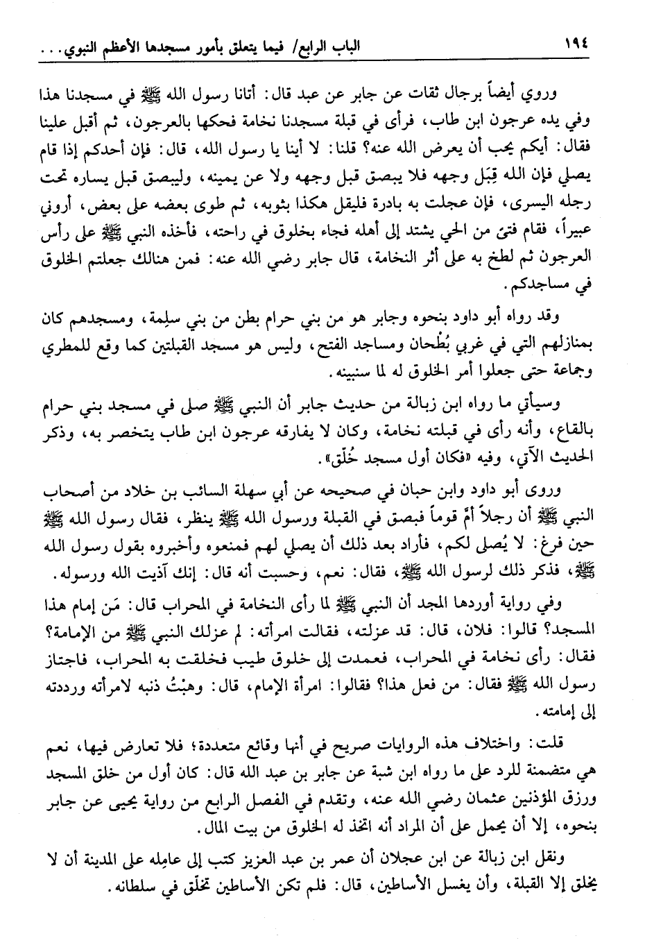 وروى ابن شبة عن شيخه خلاد بن يزيد بن عبد العزيز بن أبي رواد عن نافع عن ابن عمر أن النبي صلّى الله عليه وسلّم صلّى صلاة ذات يوم، فرأى في قبلة المسجد نخامة، فلما قضى صلاته أخذ عودا فحكها، ثم دعا يخلوق فخلّق مكانها، ثم أقبل على الناس فقال: يا أيها الناس إذا صلى أحدكم فلا يتفل أمامه ولا عن يمينه؛ فإنه يستقبل الرب عز وجل بوجهه.