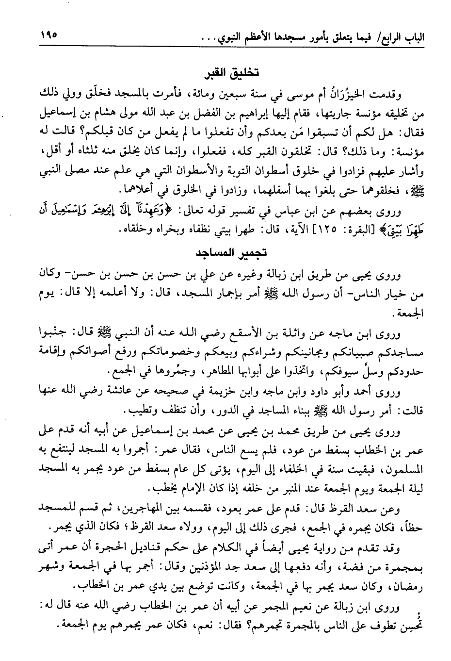 قلت: واختلاف هذه الروايات صريح في أنها وقائع متعددة؛ فلا تعارض فيها، نعم هي متضمنة للرد على ما رواه ابن شبة عن جابر بن عبد الله قال: كان أول من خلق المسجد ورزق المؤذنين عثمان رضي الله عنه، وتقدم في الفصل الرابع من رواية يحيى عن جابر بنحوه، إلا أن يحمل على أن المراد أنه اتخذ له الخلوق من بيت المال.