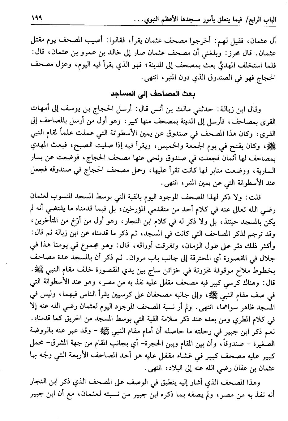 قلت: الذي عليه السلف والخلف استحباب ذلك، وفي الصحيح «إنما بنيت- يعني المساجد- لذكر الله والصلاة وقراءة القرآن» وهو عام في المصاحف وغيرها، وقد روى ابن شبة عن عبيد الله بن عبد الله بن عتبة قال: إن أول من جمع القرآن في مصحف وكتبه عثمان بن عفان رضي الله عنه، ثم وضعه في المسجد، فأمر به يقرأ كل غداة. وعن محرز ابن ثابت مولى سلمة بن عبد الملك عن أبيه قال: كنت في حرس الحجاج بن يوسف، فكتب الحجاج المصاحف، ثم بعث بها إلى الأمصار، وبعث بمصحف إلى المدينة، فكره ذلك