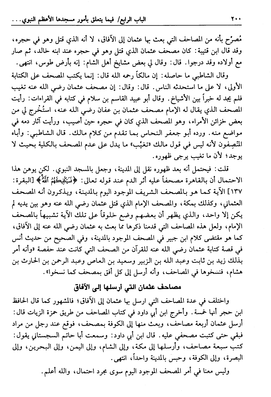 قلت: ولا ذكر لهذا المصحف الموجود اليوم بالقبة التي بوسط المسجد المنسوب لعثمان رضي الله تعالى عنه في كلام أحد من متقدمي المؤرخين، بل فيما قدمناه ما يقتضي أنه لم يكن بالمسجد حينئذ، بل ولا ذكر له في كلام ابن النجار، وهو أول من أرّخ من المتأخرين، وقد ترجم لذكر المصاحف التي كانت في المسجد، ثم ذكر ما قدمناه عن ابن زبالة ثم قال:
