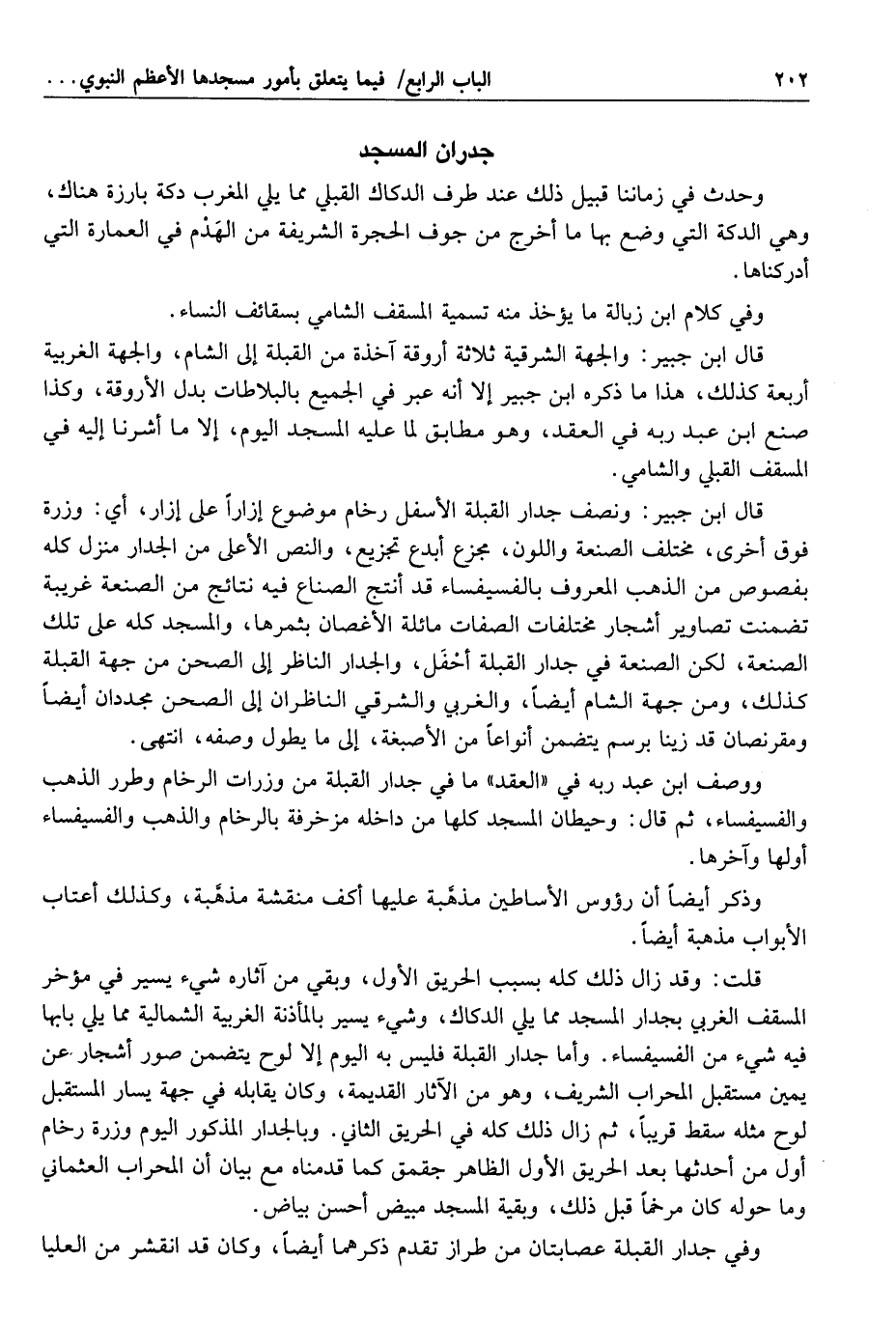 قلت: وهذا موافق لما قدمناه في زيادة المهدي عن ابن زبالة من أنه جعل خمس أساطين في السقائف الشامية، وقدمنا أن الموجود به اليوم أربع فقط، وذلك أربعة أروقة، فكأنه لما زيد بعد الحريق الأول الرواقان في مسقف القبلة اختصروا رواقا من المسقف الشامي فأدخلوه في صحن المسجد، ولم أر من نبه على ذلك من المؤرخين، وهذا المسقف هو المسمى اليوم بالدكاك؛ لارتفاعه على بقية أرض المسجد، ولم أعلم وقت حدوث ذلك، ولم يتعرض ابن جبير لذكر ارتفاعه مع ذكره لما دون ذلك، وقد كانت رحلته قبل حريق المسجد الأول فلعل ذلك مما حدث بعده، كما حدثت الدكتان اللتان بجنبتي المسجد في الحريق الثاني كما سبق.