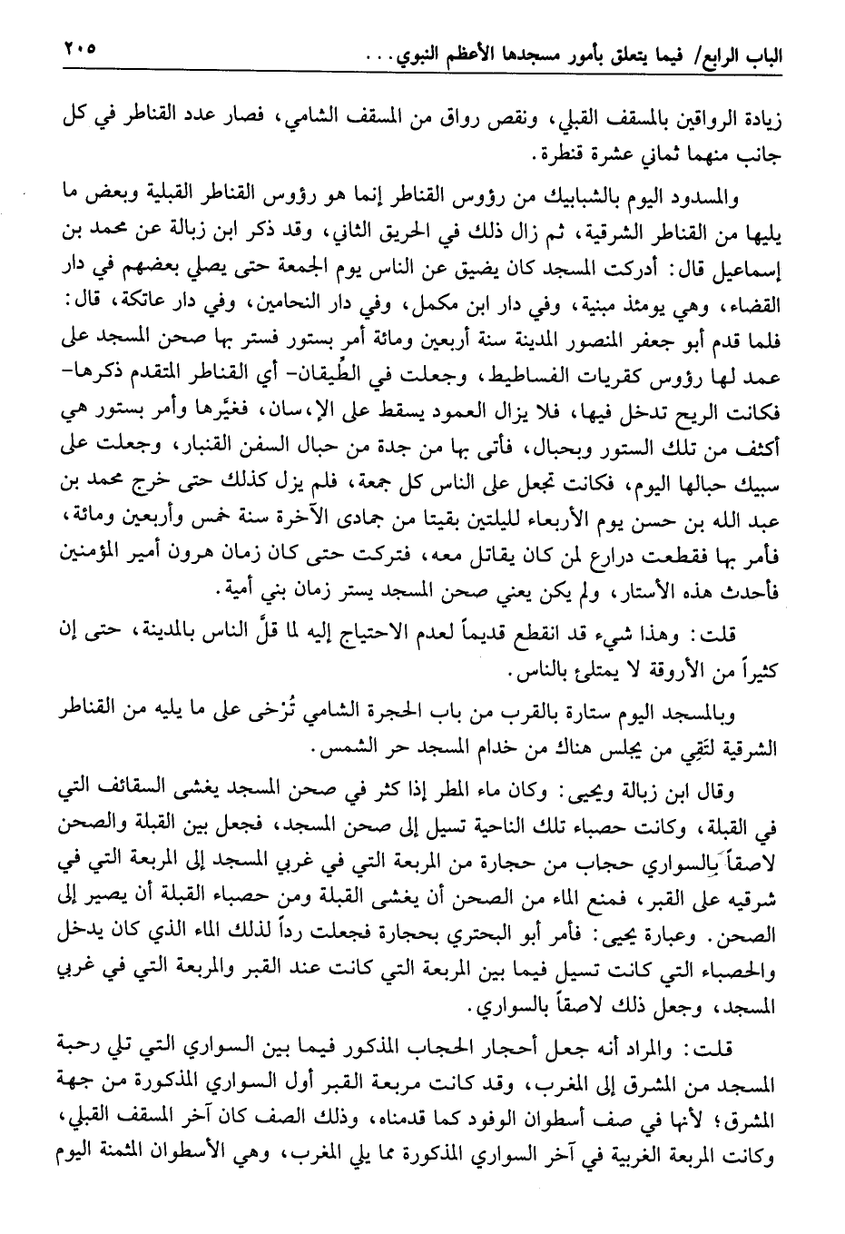 قلت: وأراد بالقسي ما نسميه اليوم بالقناطر المعقودة حول صحن المسجد، وأما الأساطين الداخلة في الأروقة فإنها متصلة بالسقف، سوى الرواقين اللذين يليان رحبة المسجد من المسقف القبلي، ثم جعل المسقف القبلي كنسبتهما بعد العمارة المتجددة بعد الحريق الثاني كما سبق.