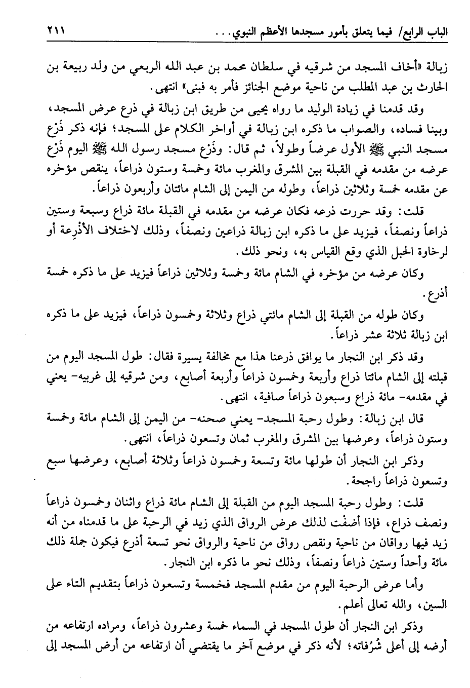 وقال ابن زبالة ويحيى: وعرض منقبة جدار المسجد مما يلي المغرب ذراعان ينقصان شيئا، وعرض منقبته مما يلي المشرق ذراعان وأربعة أصابع، وإنما زيد فيه لأنها من ناحية السيل.
