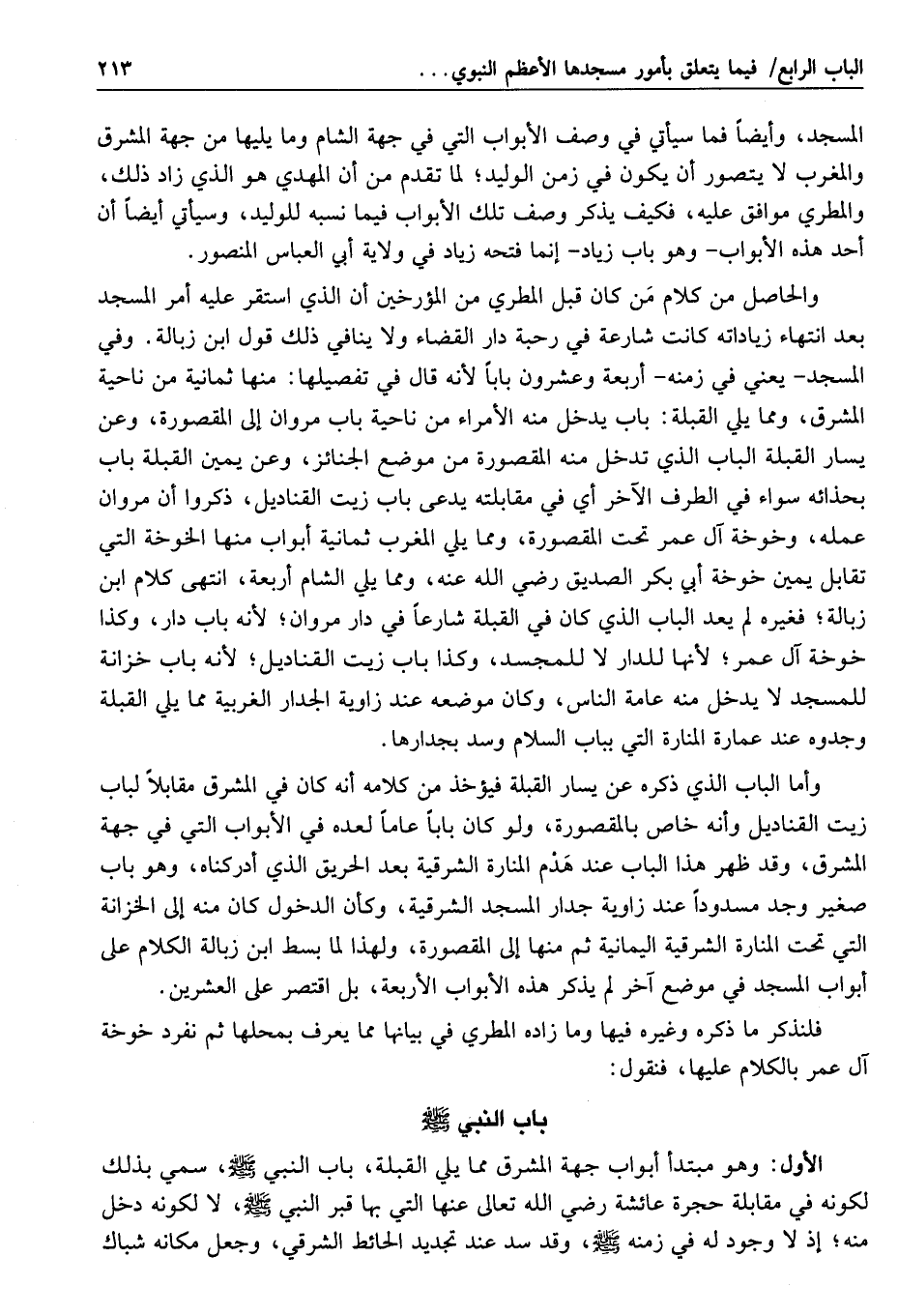 الفصل الثاني والثلاثون في أبواب المسجد وما سد منها، وما بقي، وما يحاذيها من الدور قديما وحديثا