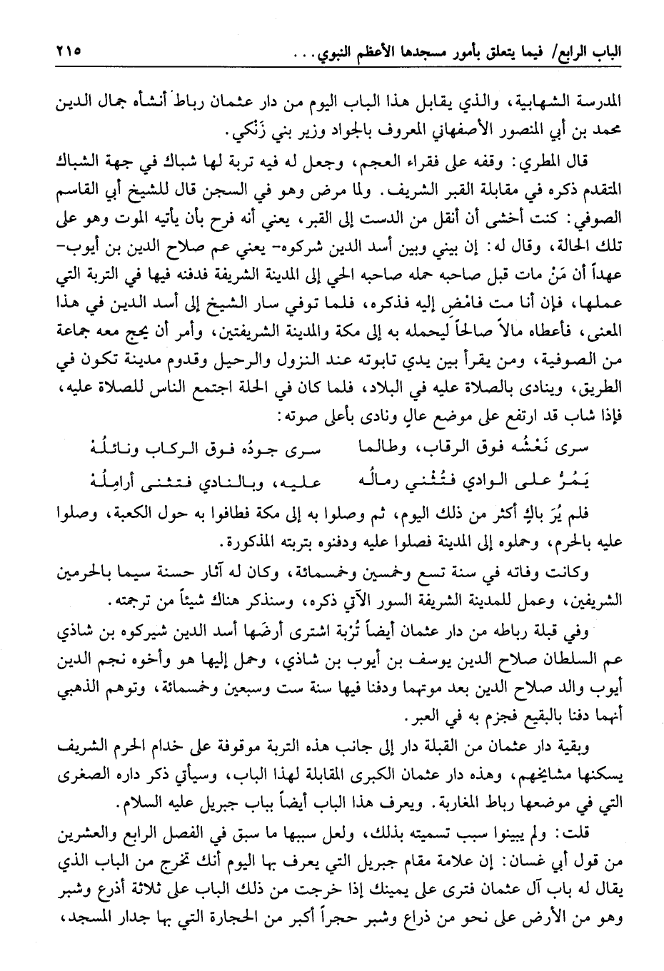 ثم ذكر أيضا في الكتابة من خارج الجدار على الأبواب نحو هذا، وقالا أيضا: إن في القبلة من خارج المسجد في موضع الجنائز حيث يصلي على الموتى عند باب علي بن أبي طالب مكتوب بعد البسملة إِنَّ فِي خَلْقِ السَّماواتِ وَالْأَرْضِ [آل عمران: 190] الآية فاقتضى ذلك أن باب علي هو أول أبواب هذه الجهة، وأن باب النبي صلّى الله عليه وسلّم هو الثاني منها، والذي حمل المطري ومن تبعه على مخالفة ذلك ما قدمناه عنه من رعاية تلك المناسبة، ويحتمل: