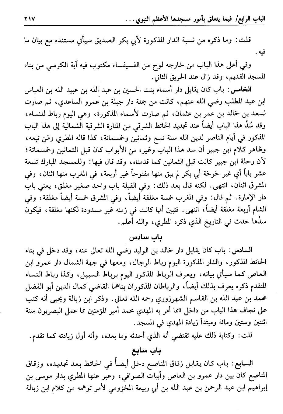 مع ما قدمناه أيضا من أن الأصل في ذلك أن جبريل عليه السلام في غزوة بني قريظة أتى على فرس عليه اللأمة حتى وقف بباب المسجد عند موضع الجنائز، ولم يكن ثم حينئذ غير الباب المذكور وروى ابن زبالة عن المطلب بن عبد الله أن حارثة بن النعمان مرّ والنبي صلّى الله عليه وسلّم مع جبريل في موضع الجنائز، فمر ولم يسلم، فقال جبريل للنبي صلّى الله عليه وسلّم: أهو ممن شهد بدرا؟