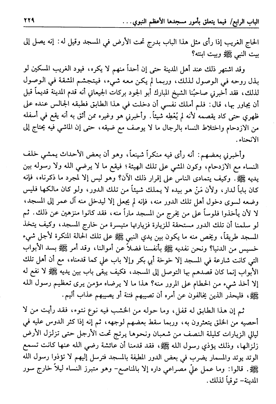 وقد اختلقوا لتلك الدور أسماء، حتى قالوا في بعضها: هو بيت النبي صلّى الله عليه وسلّم، وبعضها نسبوه إلى فاطمة ابنته رضي الله تعالى عنها. ويتخذ بعض أهل تلك الدور على ما بلغني كحلا في نقرة من الجدار ويقولون للحجاج: هذه مكحلة فاطمة الزهراء رضي الله تعالى عنها، ويشيرون أيضا إلى رحا عندهم فيقولون: هذه رحا فاطمة الزهراء، أخبرني بذلك من لبّسوا عليه الأمر وأخبروه بهذه الأكاذيب حتى أعطاهم شيئا. ويجلس عند ذلك الطابق بالمسجد شخص ليس هو اليوم من ذرية آل عمر؛ لأن من كان بيدهم مفتاح هذا الطابق من آل عمر قد انقرضوا، وبقيت منهم زوجة هذا الشخص الذي يجلس عند هذا الطابق، ثم توفيت وتركت أولادا منه، فاستمر المفتاح بيده، فيستنيب من يجلس عند هذا الطابق ويفتحه أيام الموسم، ويقف عنده جماعة يزوّرون الحجاج ويأخذون من الداخلين منه شيئا شبيها بالمكس؛ فإن الجالس عنده لا يمكن أحدا من الدخول منه إلا ببذل شيء يرضيه، وما حال