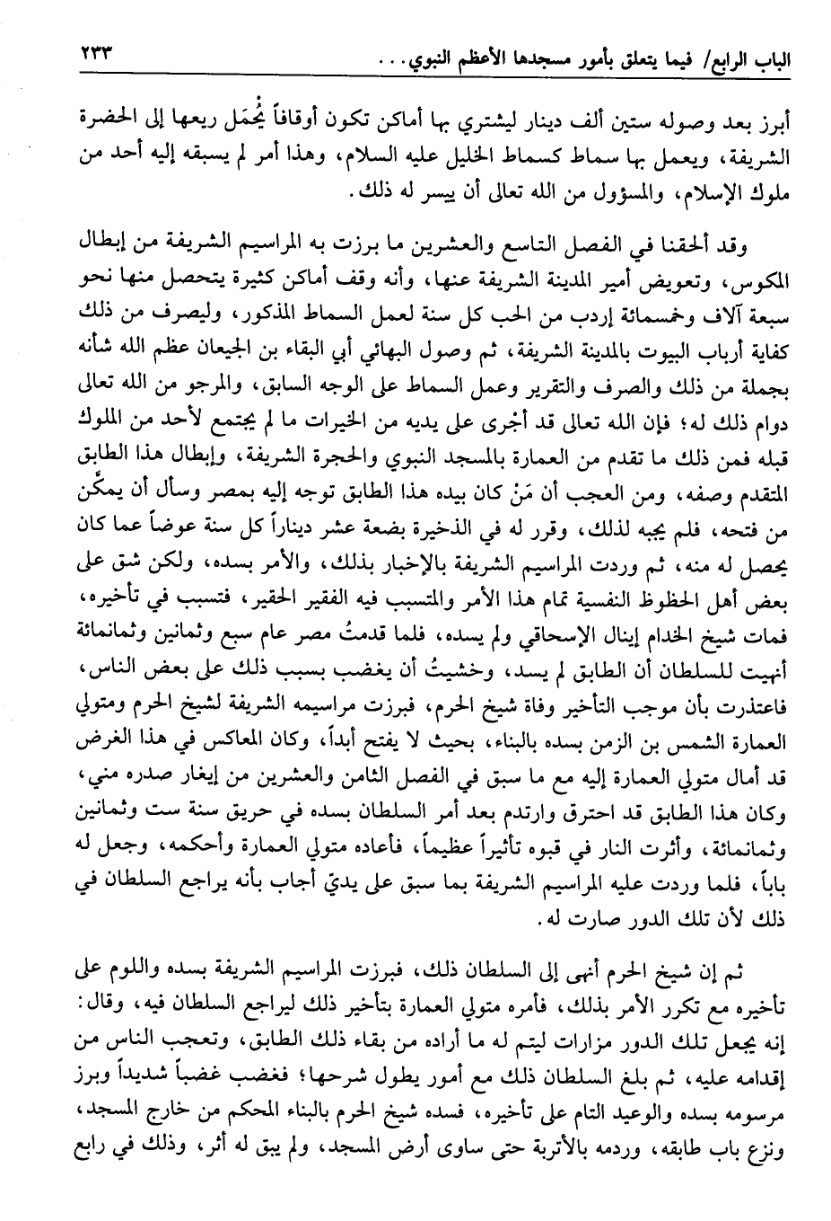وفرق بالمدينة الشريفة مالا جزيلا ستة آلاف دينار أو أكثر، ودفع إليّ على يد إمامه المشار إليه من ذلك جزآ وافرا، وتكلمات معه في رفع مكوس المدينة وتعويض أميرها عن ذلك شيئا، فأفهم الوعد به، وسألني عن أمر دار العباس التي اشتريت له، وكانت سببا في قتل القضائي الزكوي تغمده الله تعالى برحمته لعدم السياسة في أخذها، فأخبرته بحقيقة الحال، فقال: لم لم تكتب إلّي بهذا؟ فاعتذرت له بعذر قبله، وتبرأ من جميع ما فعلوا فيها، ووعد بما يكون فيه صلاح أمرها، ثم وفى بذلك بعد عوده، فزادهم مبلغا كثيرا رضوا به، وتفضل بالتشريف بطلب الكتابة إليه بما يكون فيه صلاح أحوال المدينة والتنبيه على من يردها من المحتاجين.
