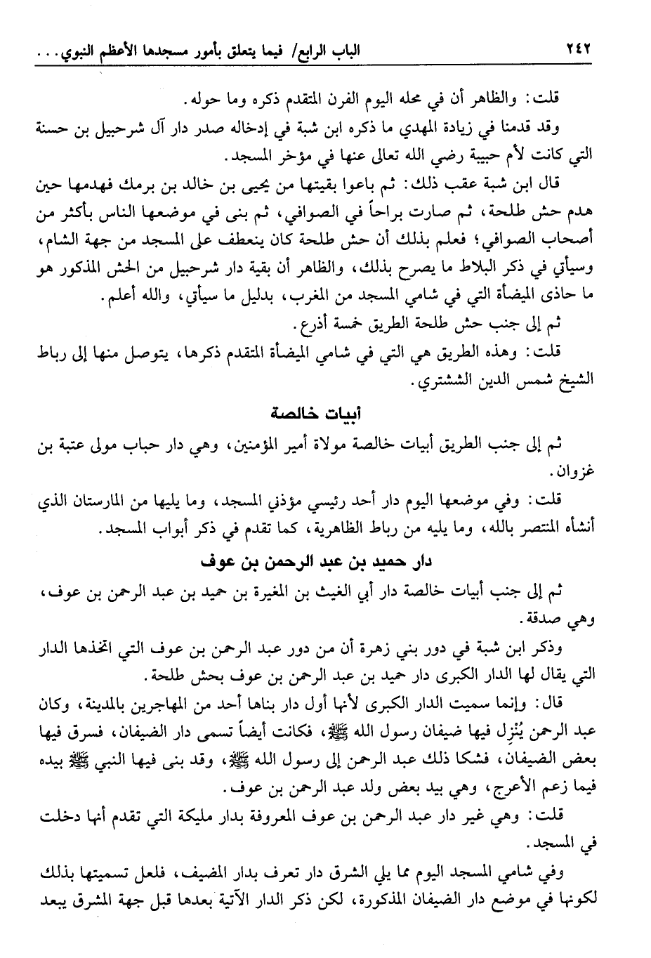 ثم إلى دار جعفر بن يحيى دار نصير صاحب المصلى، كانت بيتا لسكينة بنت الحسين بن علي رضي الله عنهم، ثم إلى جنبها الطريق إلى دار طلحة بن عبيد الله ستة أذرع.