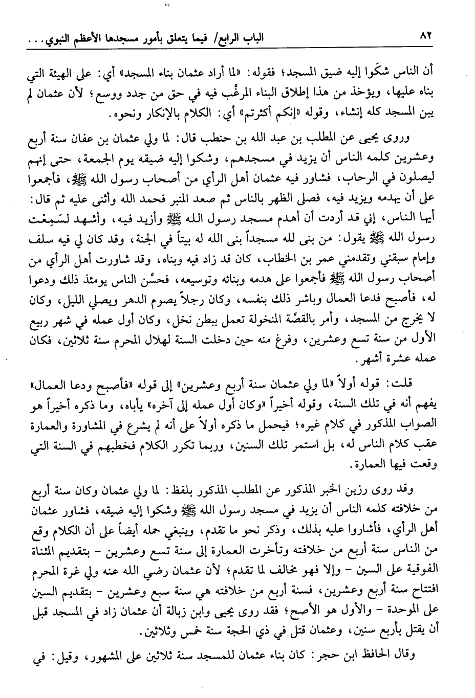 وقوله في الرواية الأولى إن عثمان أراد بناء المسجد يبين أن المراد من قوله حين بناء المسجد حين أراد بناءه، إلا أن يكون ذلك قد تكرر من عثمان لتكرر كلامهم قبل البناء وبعده، وهو الأقرب، وقوله «وأحبوا أن يدعه على هيئته» أي بجذوع النخل واللبن كما فعل عمر رضي الله عنه لموافقته لفعله صلّى الله عليه وسلّم، ولهذا قال البغوي في شرح السنة: لعل الذي كره الصحابة من عثمان بناؤه بالحجارة المنقوشة، لا مجرد توسيعه، اه. ويؤيده ما سيأتي من
