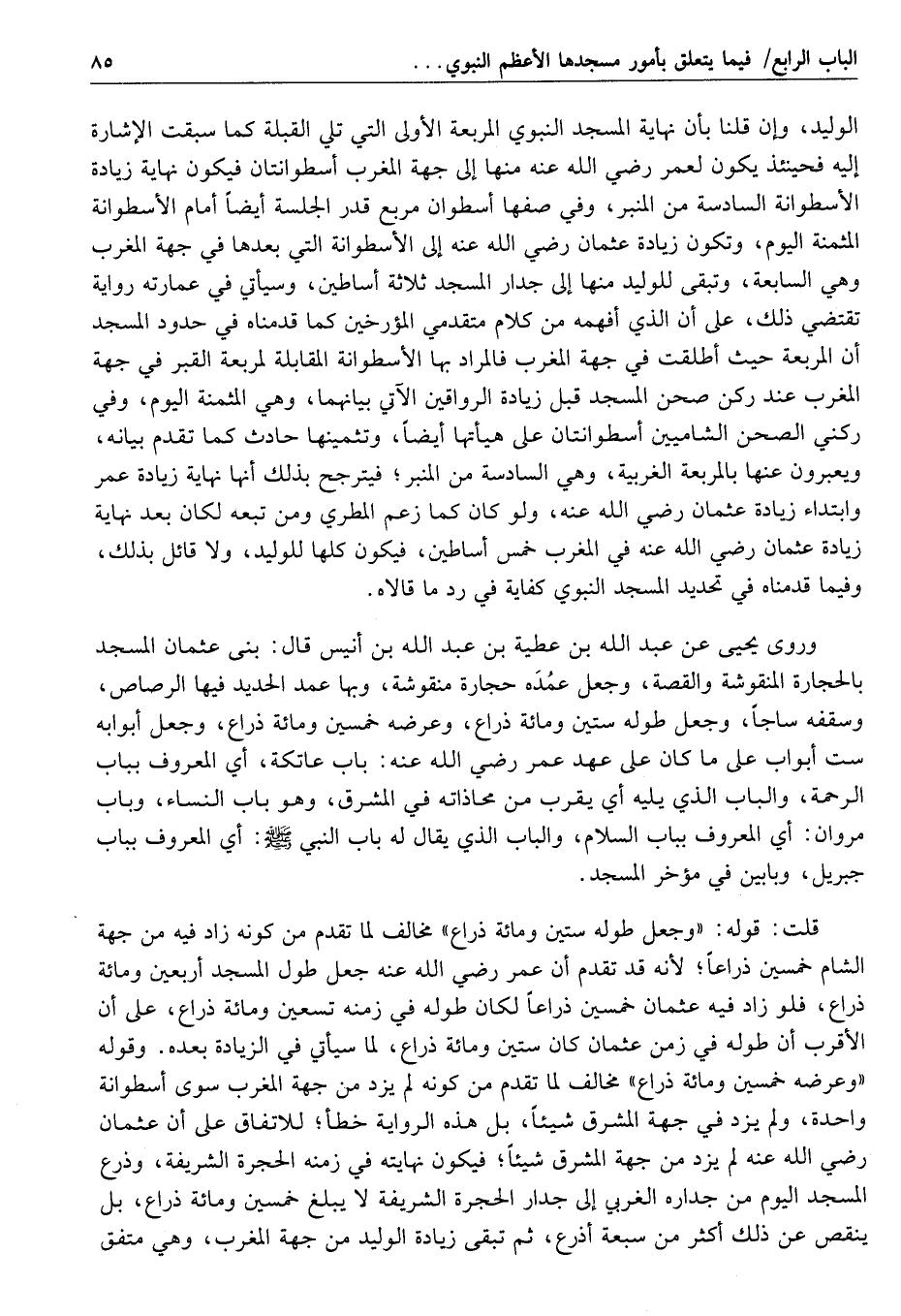 ومحصله أن زيادة عثمان هي الرواق الكائن بين الأسطوانتين المذكورتين، ولم أر من سبقهما لذلك، وقد قدمنا في تحديد المسجد النبوي ما يقتضي أن الطراز المذكور في موازاة حد المسجد النبوي على الراجح، وأن زيادة عمر وعثمان رضي الله عنهما من بعد ذلك في جهة المغرب، وأن عمر رضي الله عنه جعل المشرق إلى المغرب مائة وعشرين ذراعا، وأن من المربعة التي ذكرا أنها نهاية زيادته إلى الحجرة الشريفة ينقص عن تسعين ذراعا، وإلى محاذاة الطراز نحو المائة؛ فيبقى لعمر في جهة المغرب بعد الطراز رواقان آخران؛ فيكون نهاية المسجد في زمنه الأسطوانة السابعة من المنبر، وفي صف السابعة من المنبر أسطوان أسفله مربع لكنه ليس مرتفعا عن الأرض بقدر الجلسة، بل تربيعه على وجه الأرض، وقد زال تربيعه في العمارة الحادثة بعد الحريق الثاني، وليس هو في صف الأساطين التي تلي القبلة، بل في صف الأساطين التي خلف محراب الحنفية؛ فالظاهر أن هذه المربعة هي المرادة هنا؛ فيكون لعثمان رضي الله عنه في جهة المغرب الرواق الذي بعدها؛ فيكون نهاية المسجد في زمننه الأسطوانة الثامنة من المنبر في جهة المغرب، ويدل على صحة ذلك ما سيأتي أن الوليد زاد بعد عثمان رضي الله عنه في جهة المغرب أسطوانين، ولم يزد أحد بعد الوليد في جهة المغرب شيئا، والباقي من الأسطوانة الثامنة من المنبر أسطوانتان فقط في جهة المغرب، فهما زيادة الوليد، وهناك أسطوان مربعة مرتفعة قدر الجلسة أيضا أمام الأسطوانة بوجاه الداخل من باب السلام، الظاهر أنها جعلت علامة لنهاية زيادة عثمان رضي الله عنه، وابتداء زيادة
