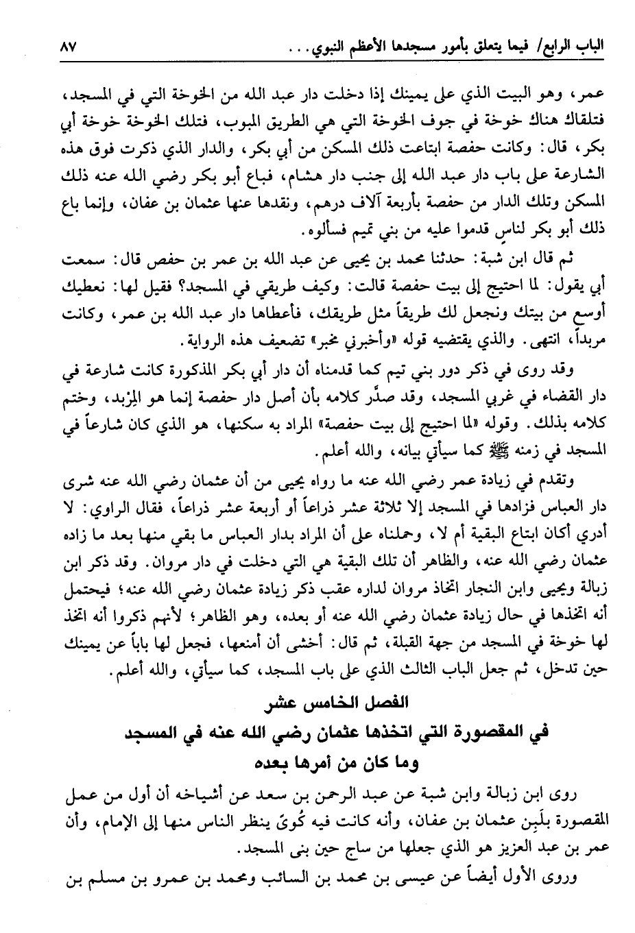 قلت: وهذه العبارة محتملة لأن القائل «نعطيك إلى آخره» عمر أو عثمان رضي الله عنهما، ويرجح الثاني أنه أورده في سياق زيادة عثمان رضي الله عنه، وأنه روى عقبة عن عبد الرحمن بن سعد عن أشياخه أن عمر قدم جدار القبلة إلى المقصورة، ثم قدمه عثمان إلى موضعه اليوم، وأخل بقية دار العباس بن عبد المطلب مما يلي القبلة والشام والمغرب، وأدخل بعض بيوت حفصة بنت عمر مما يلي القبلة، فقام المسجد على تلك الحال حتى زاد فيه الوليد.