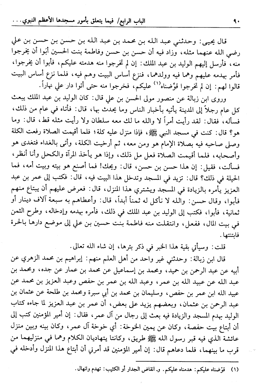 وقال ابن زبالة: حدثني عبد العزيز بن محمد عن بعض أهل العلم قال: قدم الوليد بن عبد الملك حاجا، فبينا هو يخطب الناس على منبر رسول الله صلّى الله عليه وسلّم إذ حانت منه التفاتة فإذا بحسن بن حسن بن علي بن أبي طالب في بيت فاطمة في يده مرآة ينظر فيها، فلما نزل أرسل إلى عمر بن عبد العزيز فقال: لا أرى هذا قد بقي بعد، اشتر هذه المواضع، وأدخل بيت النبي صلّى الله عليه وسلّم في المسجد، واسدده.