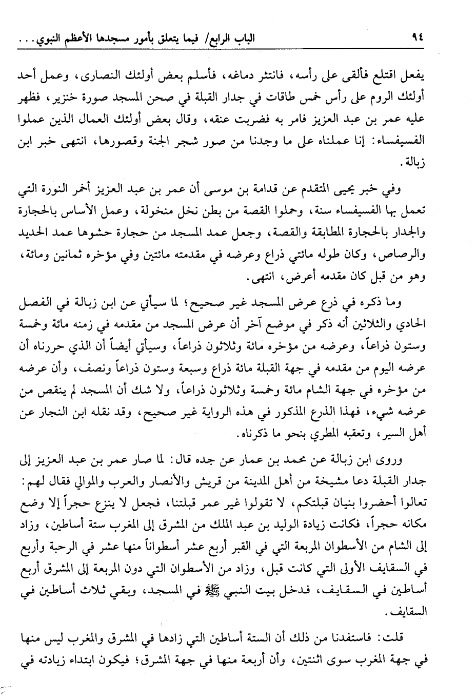 في المسجد أسطوانا بعد المربعة، فيكون زيادة الوليد بعد ذلك في جهة المغرب، فلا يصح إدخاله لدار أبي سبرة؛ لقوله إنها كانت في موضع المربعة، إلا أن يريد بالمربعة هنا الأسطوانة التي عن يمينك إذا دخلت من الباب الذي يلي دار مروان، وهو باب السلام، وهي الثانية من الباب المذكور، فإنها أول زيادة الوليد؛ لقوله في رواية يحيى المتقدمة «ومده في المغرب أسطوانين» لكن قال ابن شبة نقلا عن ابن أبي يحيى: إنه كانت لأبي سبرة بن أبي رهم دار موضعها عند الأسطوان المربعة التي في المسجد اليمانية الغربية، وكانت جديدة، وكانت هناك دار لعمار بن ياسر، فأدخلتا في المسجد، انتهى. وهو ظاهر في أن المراد بالمربعة الأسطوان المثمنة اليوم التي قدمنا وصفها في زيادة عثمان رضي الله عنه، وقوله «وبعض دار العباس بن عبد المطلب» ظاهر أيضا في أن الوليد أدخل من دار العباس شيئا، ولعله مما كان بقي منها وأدخله مروان في داره، فيستفاد منه أن الوليد أدخل بعض دار مروان وهو ظاهر؛ لما قدمناه من أن دار مروان كانت ملاصقة للمسجد في جهة المغرب ولها خوخة فيه، ولا شك أنه اتخذها قبل زيادة الوليد، فإن وفاة مروان كانت في سنة خمس وستين بعد أن أقام في الخلافة عشرة أشهر.