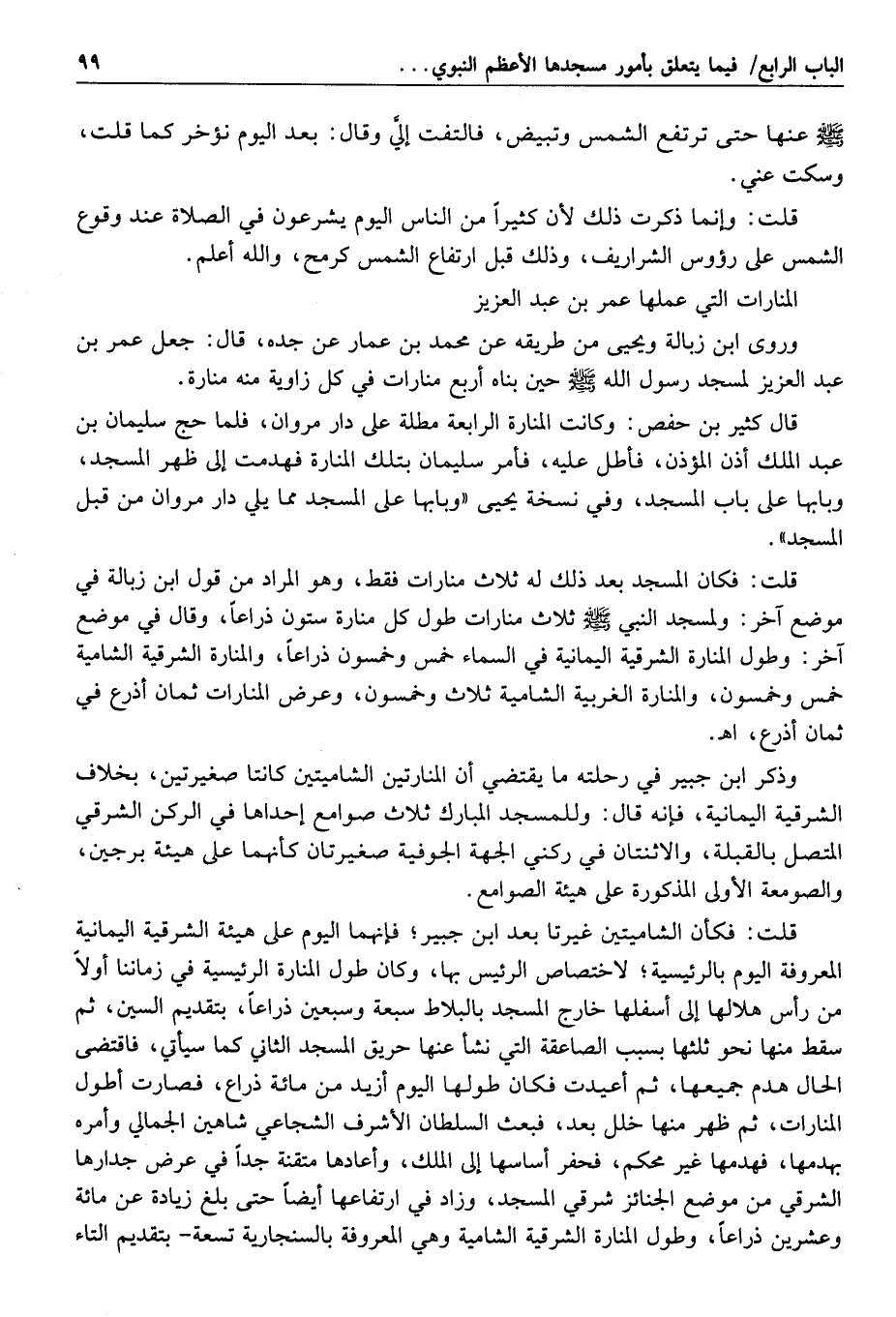 الفصل السابع عشر فيما اتخذه عمر في المسجد في زيادة الوليد من المحراب والشّرفات والمنائر، واتخاذ الحرس، ومنعهم من الصلاة على الجنائز فيه