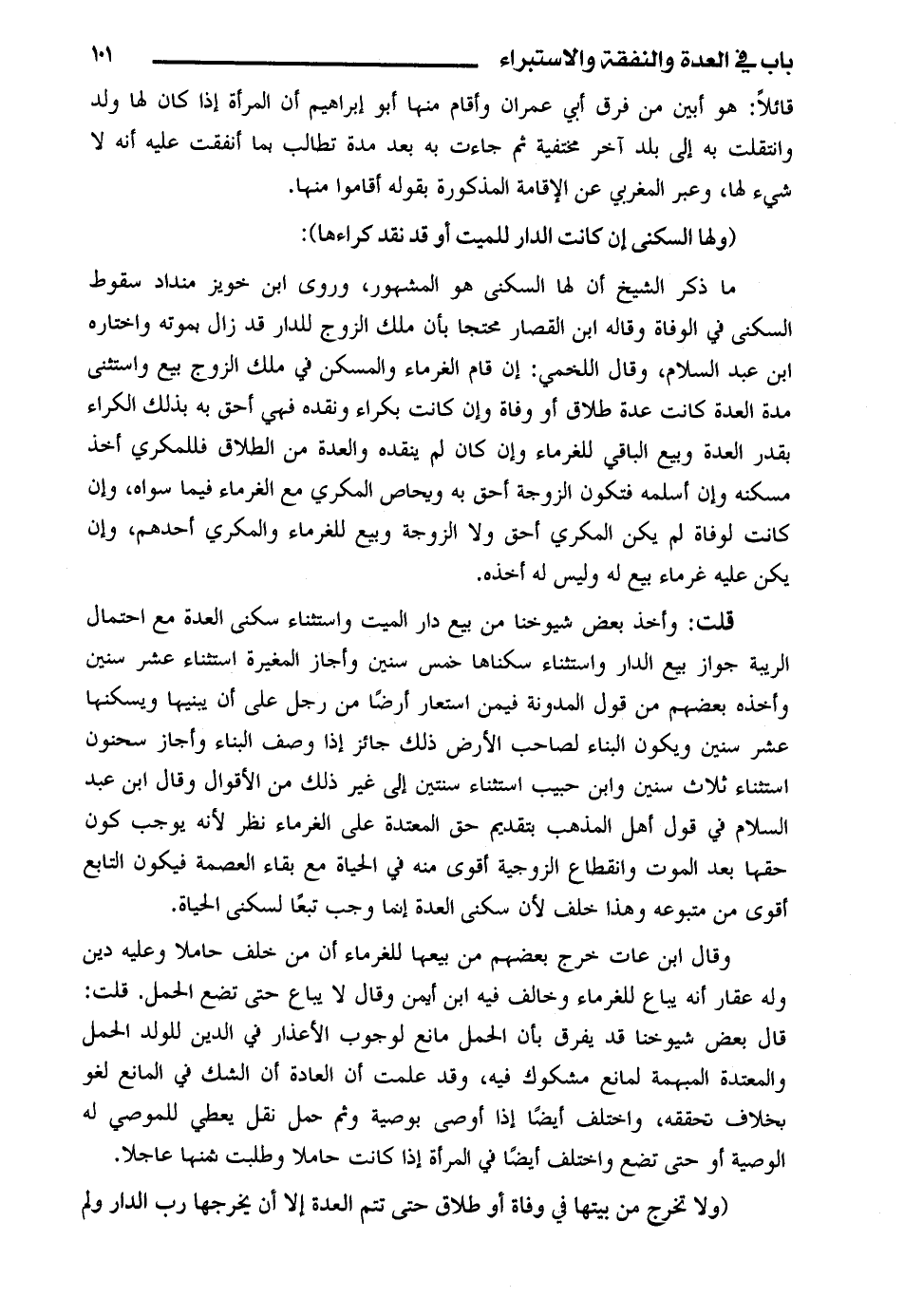قلت: وأخذ بعض شيوخنا من بيع دار الميت واستثناء سكنى العدة مع احتمال الريبة جواز بيع الدار واستثناء سكناها خمس سنين وأجاز المغيرة استثناء عشر سنين وأخذه بعضهم من قول المدونة فيمن استعار أرضًا من رجل على أن يبنيها ويسكنها عشر سنين ويكون البناء لصاحب الأرض ذلك جائز إذا وصف البناء وأجاز سحنون استثناء ثلاث سنين وابن حبيب استثناء سنتين إلى غير ذلك من الأقوال وقال ابن عبد السلام في قول أهل المذهب بتقديم حق المعتدة على الغرماء نظر لأنه يوجب كون حقها بعد الموت وانقطاع الزوجية أقوى منه في الحياة مع بقاء العصمة فيكون التابع أقوى من متبوعه وهذا خلف لأن سكنى العدة إنما وجب تبعًا لسكني الحياة.