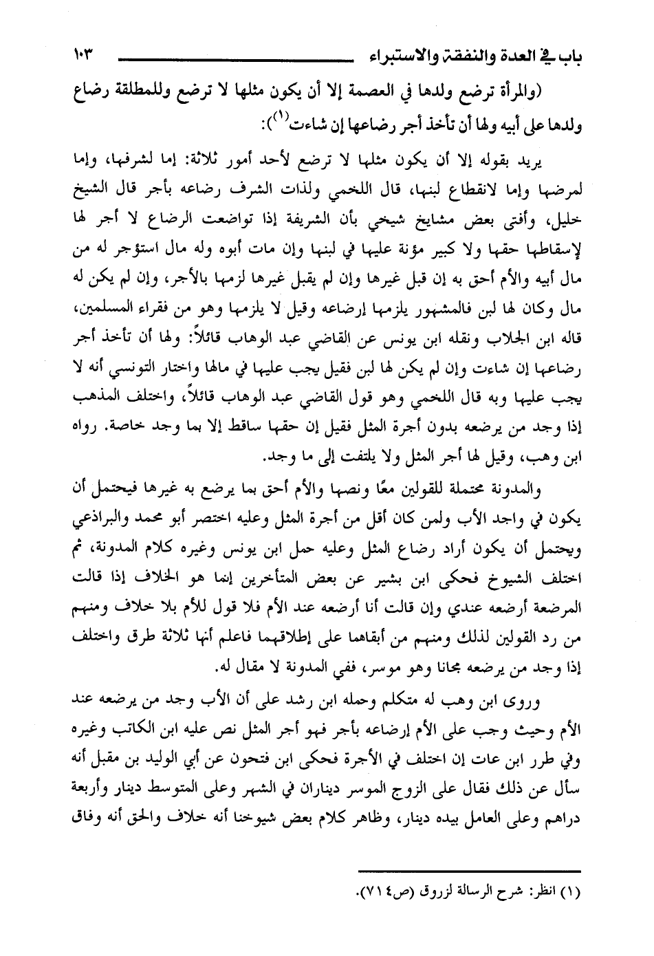 يريد بقوله إلا أن يكون مثلها لا ترضع لأحد أمور ثلاثة: إما لشرفها، وإما لمرضها وإما لانقطاعه لبنها، قال اللخمي ولذات الشرف رضاعه بأجر قال الشيخ خليل، وأفتى بعض مشايخ شيخي بأن الشريفة إذا تواضعت الرضاع لا أجر لها لإسقاطها حقها ولا كبير مؤنة عليها في لبنها وإن مات أبوه وله مال استؤجر له من مال أبيه والأم أحق به إن قبل غيرها وإن لم يقبل غيرها لزمها بالأجر، وإن لم يكن له مال وكان لها لبن فالمشهور يلزمها إرضاعه وقيل لا يلزمها وهو من فقراء المسلمين، قاله ابن الجلاب ونقله ابن يونس عن القاضي عبد الوهاب قائلاً: ولها أن تأخذ أجر رضاعها إن شاءت وإن لم يكن لها لبن فقيل يجب عليها في مالها واختار التونسي أنه لا يجب عليها وبه قال اللخمي وهو قول القاضي عبد الوهاب قائلاً: واختلف المذهب إذا وجد من يرضعه بدون أجره المثل فقيل إن حقها ساقط إلا بما وجد خاصة. رواه ابن وهب، وقيل لها أجر المثل ولا يلتفت إلى ما وجد.