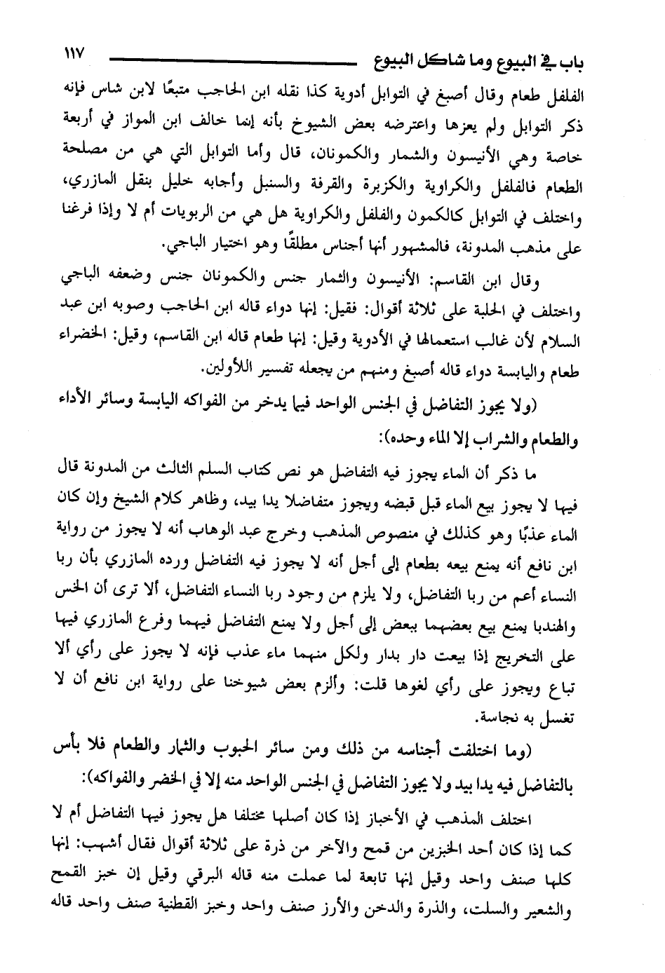 الفلفل طعام وقال أصبغ في التوابل أدوية كذلك نقله ابن الحاجب متبعًا لابن شاس فإنه ذكر التوابل ولم يعزها واعترضه بعض الشيوخ بأنه إنما خالف ابن المواز في أربعة خاصة وهي الأنيسون والشمار والكمونان، قال وأما التوابل التي هي من مصلحة الطعام فالفلفل والكراوية والكزبرة والقرفة والسنبل وأجابة خليل بنقل المازري، واختلف في التوابل كالكمون والفلفل والكراوية هل هي من الربويات أم لا وإذا فرغنا على مذهب المدونة، فالمشهور أنها أجناس مطلقاً وهو اختيار الباجي.
