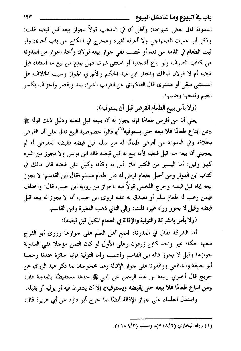 أما الشركة فقال في المدونة: أجمع أهل العلم على جوازها وروى أبو الفرج منعها حكاه غير واحد كابن زرقون وعلى الأول لو كان الثمن مؤجلا ففي المدونة جوازها وقيل لا يجوز قاله ابن القاسم وأشهب وأما التولية فإنها جائزة عندنا ومنعها أبو حنيفة والشافعي ووافقونا على جواز الإقالة وهما محجوجان بما ذكر عبد الرزاق عن جريج قال أخبرني ربيعة بن عبد الرحمن عن النبي (صلى الله عليه وسلم) حديثا مستفيضًا بالمدينة قال: " من ابتاع طعامًا فلا بيعه حتى يقبضه ويستوفيه" إلا أن يشترط فيه أو يوليه أو يقبله.