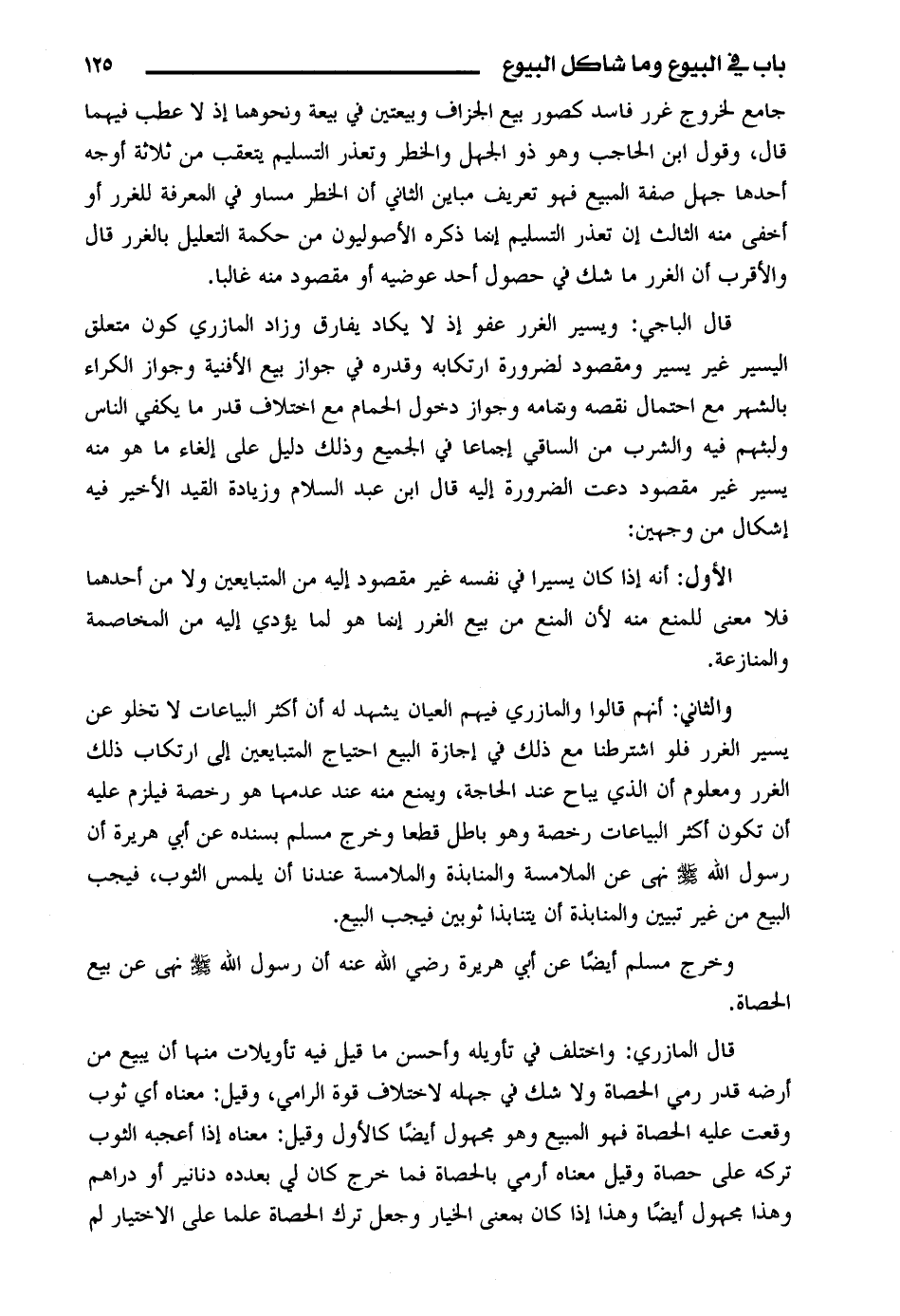 والثاني: أنهم قالوا والمازري فيهم العيان يشهد له أن أكثر البياعات لا تخلو عن يشير الغرر فلو اشترطنا مع ذلك في اجازة البيع احتياج المتبايعين إلى ارتكاب ذلك الغرر ومعلوم أن الذي يباح عند الحاجة، ويمنع منه عند عدمها هو رخصة فيلزم عليه أن تكون أكثر البياعات رخصة وهو باطل قطعا وخرج مسلم بسنده عن أبي هريرة أن رسول الله (صلى الله عليه وسلم) نهى عن الملامسة والمنابذة والملامسة عندنا أن يلمس الثوب، فيجب البيع من غير تبيين والمنابذة أن يتنابذا أن يتنابدا ثوبين فيجب البيع.