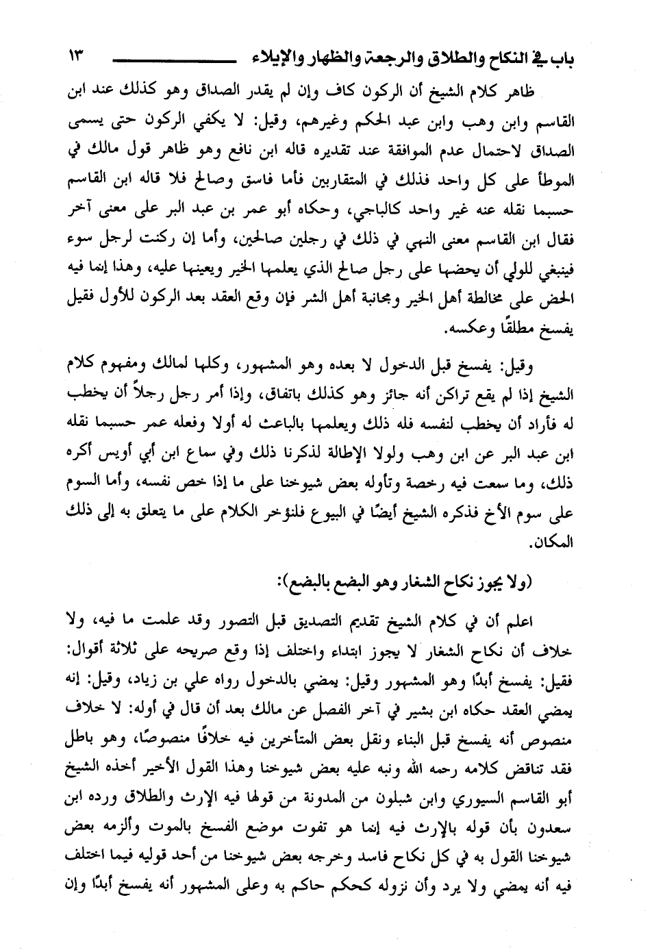 اعلم أن في كلام الشيخ تقديم التصديق قبل التصور وقد علمت ما فيه، ولا خلاف أن نكاح الشغار لا يجوز ابتداء واختلف إذا وقع صريحه على ثلاثة أقوال: فقيل: يفسخ أبدا وهو المشهور وقيل: يمضي بالدخول رواه على بن زياد، وقيل: إنه يمضي العقد حكاه ابن بشير في آخر الفصل عن مالك بعد أن قال في أوله: لا خلاف فقد تناقض كلامه رحمه الله ونبه عليه بعض شيوخنا وهذا القول الأخير أخذه الشيخ أبو القاسم السيوري وابن شبلون من المدونة من قولها فيه الإرث والطلاق ورده ابن سعدون بأن قوله بالإرث في إنما هو تفوت موضع الفسخ بالموت وألزمه بعض شيوخنا القول به منصوص أنه يفسخ قبل البناء ونقل وبعض المتأخرين فيه خلافا منصوصا، وهو باطل في كل نكاح فاسد وخرجه بعض شيوخنا من أحد قوليه فيما اختلف فيه أنه يمضي ولا يرد وأن نزوله كحكم حاكم به وعلى المشهور أنه يفسخ أبدا وإن