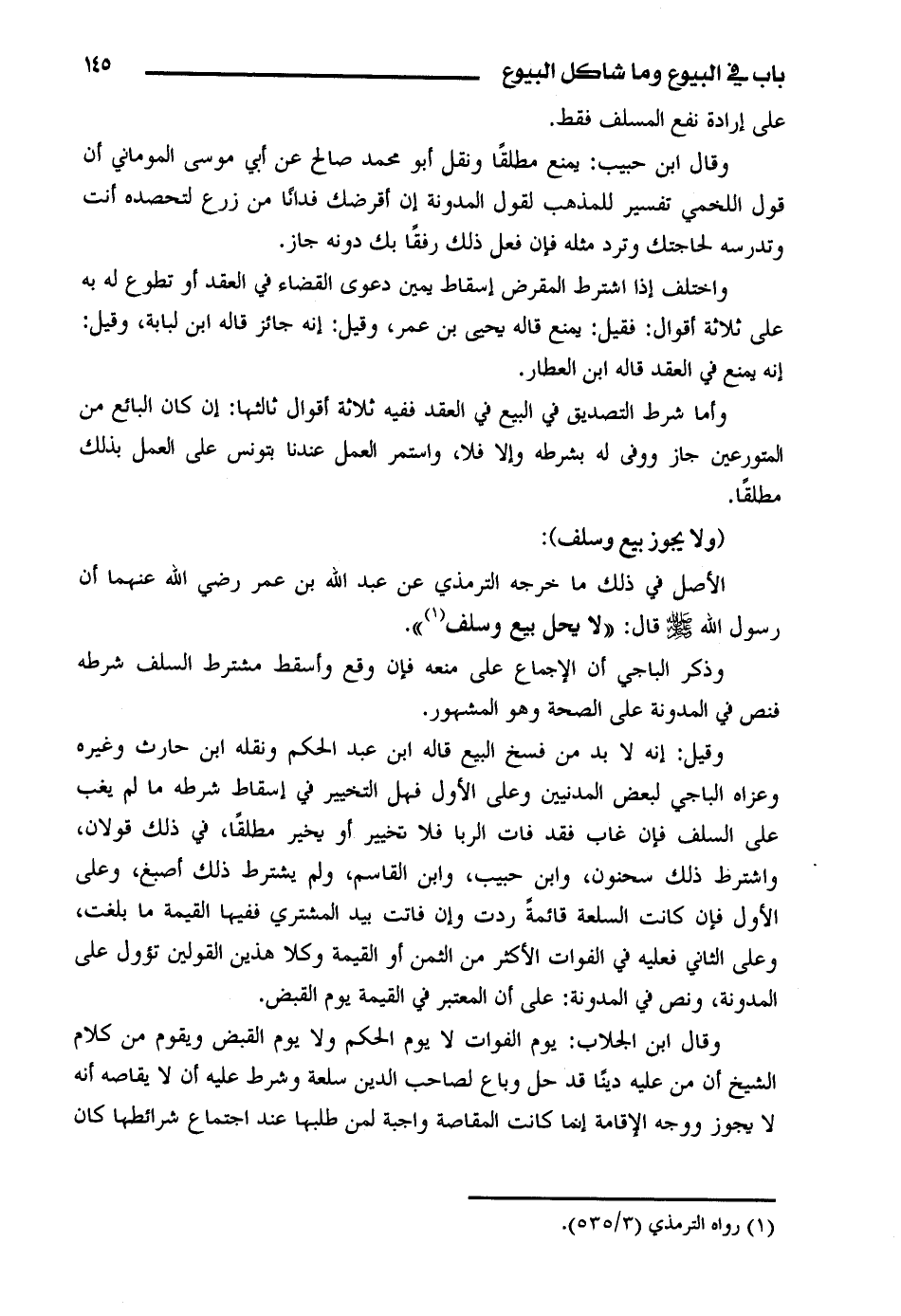 الأصل في ذلك ما خرجه الترمذي عن عبد الله بن عمر رضي الله عنهما أن رسول الله (صلى الله عليه وسلم) قال: " لا يحل بيع وسلف"