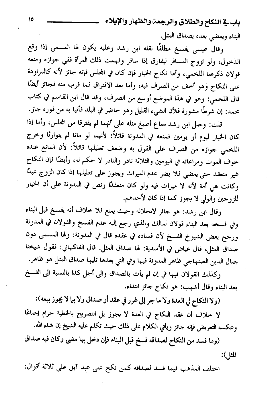وقال ابن رشد: وهو جائز لانحلاله وحيث يمنع فلا خلاف أنه يفسخ قبل البناء وفي فسخه بعد البناء قولان لمالك والذي رجع إليه عدم الفسخ والقولان في المدونة ورجح بعض الشيوخ الفسخ لأن فسادة في عقده قال في المدونة: ولها المسمى دون صداق المثل، قال عياض في الأسدية: لها صداق المثل، قال الفاكهاني: فقول شيخنا جمال الدين الصنهاجي ظاهر المدونة فيها وفي التي بعدها تليها صداق المثل هو ظاهر.
