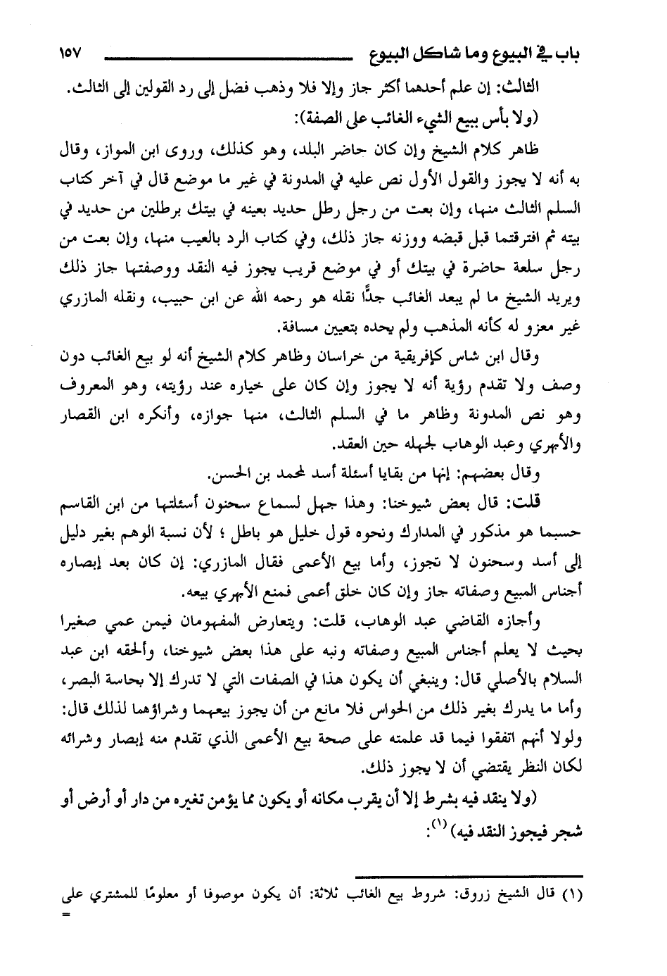 وقال ابن شاس كإفريقية من خراسان وظاهر كلام الشيخ أنه لو بيع الغائب دون وصف ولا تقدم رؤية أنه لا يجوز وإن كان على خياره عند رؤيته، وهو المعروف وهو نص المدونة وظاهر ما في السلم الثالث، منها جوازه، وأنكره ابن القصار والأبهري وعبد الوهاب لجهله حين العقد.