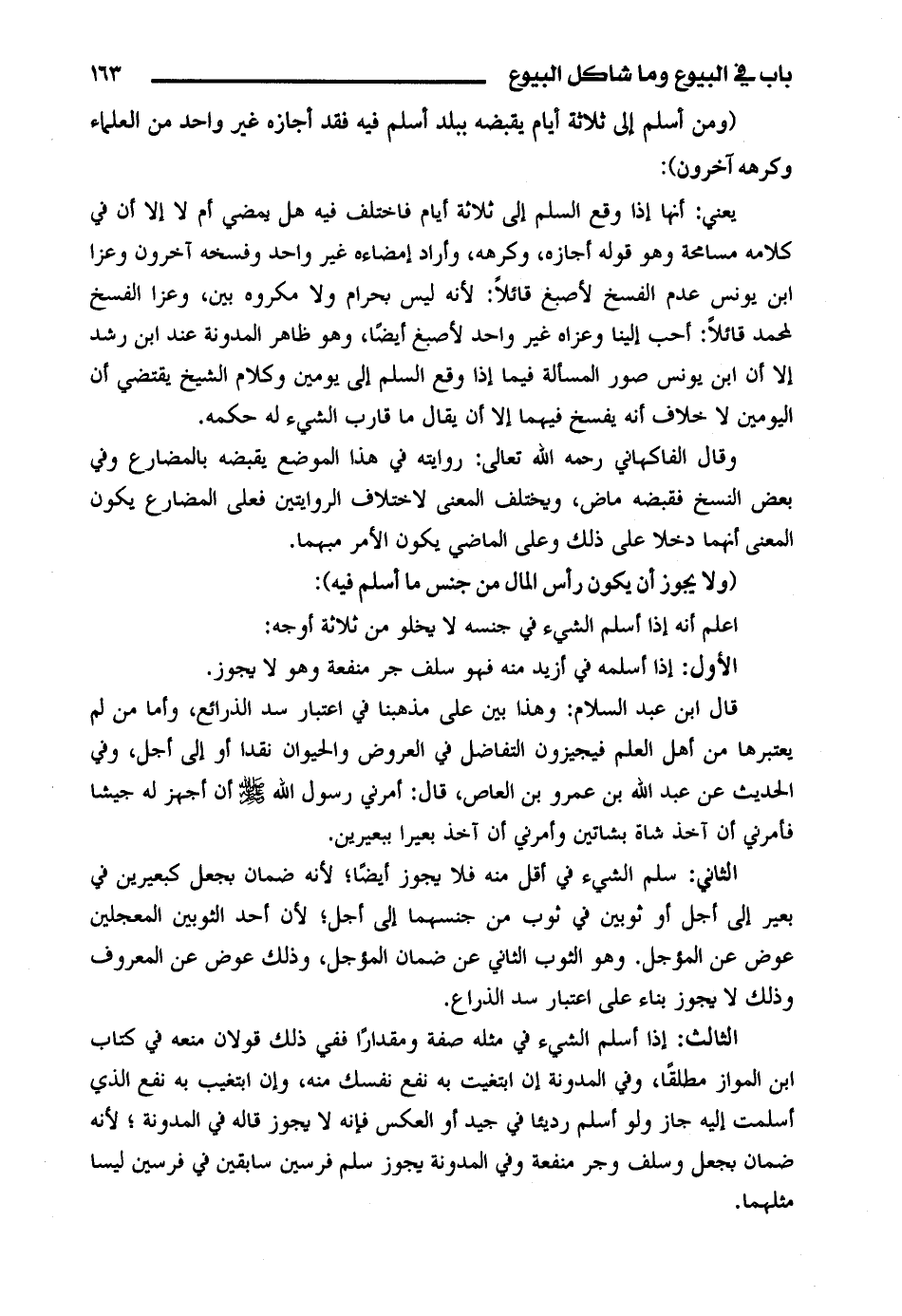 الثاني: سلم الشيء في أقل منه فلا يجوز أيضًا؛ لأنه ضمان بجعل كبعيرين في بعير إلى أجل أو ثوبين في ثوب من جنسهما إلى أجل؛ لأن أحد الثوبين المعجلين عوض عن المؤجل. وهو الثوب الثاني عن ضمان المؤجل، وذلك عوض عن المعروف وذلك لا يجوز بناء على اعتبار سد الذرائع.