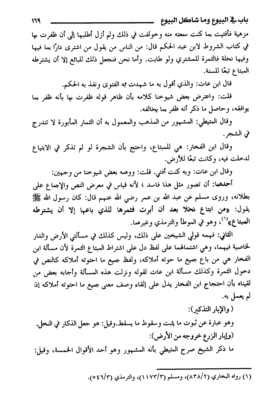 مزهية فأفتيت بما كنت سمعته منه وخولفت في ذلك ولم أزل أطلبها إلى أن ظفرت بها في كتاب الشروط لابن عبد الحكم قال: ومن الناس من يقول من اشترى داراً بما فيها وفيها نخلة فالثمرة للمشتري ولو طابت. وأما نحن فنجعل ذلك للبائع إلا أن يشترطه المبتاع تبعًا للسنة.