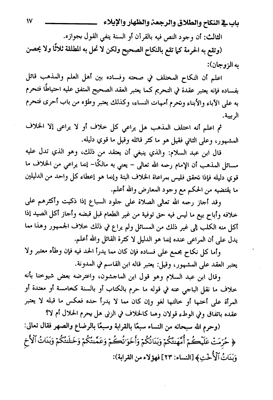 (وحرم الله سبحانه من النساء سبعا بالقرابة وسبعا بالرضاع والصهر فقال تعالى: {حرمت عليكم أمهاتكم وبناتكم وأخواتكم وعماتكم وخالاتكم وبنات الأخ وبنات الأخت} [النساء: 23]