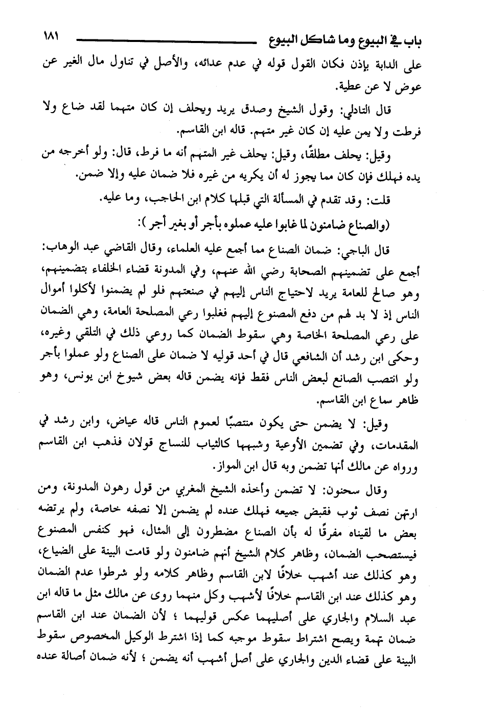 وقيل: لا يضمن حتى يكون منتصبا لعموم الناس قاله عياض، وابن رشد في المقدمات، وفي تضمين الأوعية وشبهها كالثياب للنساج قولان فذهب ابن القاسم ورواه عن مالك أنها تضمن وبه قال ابن المواز.