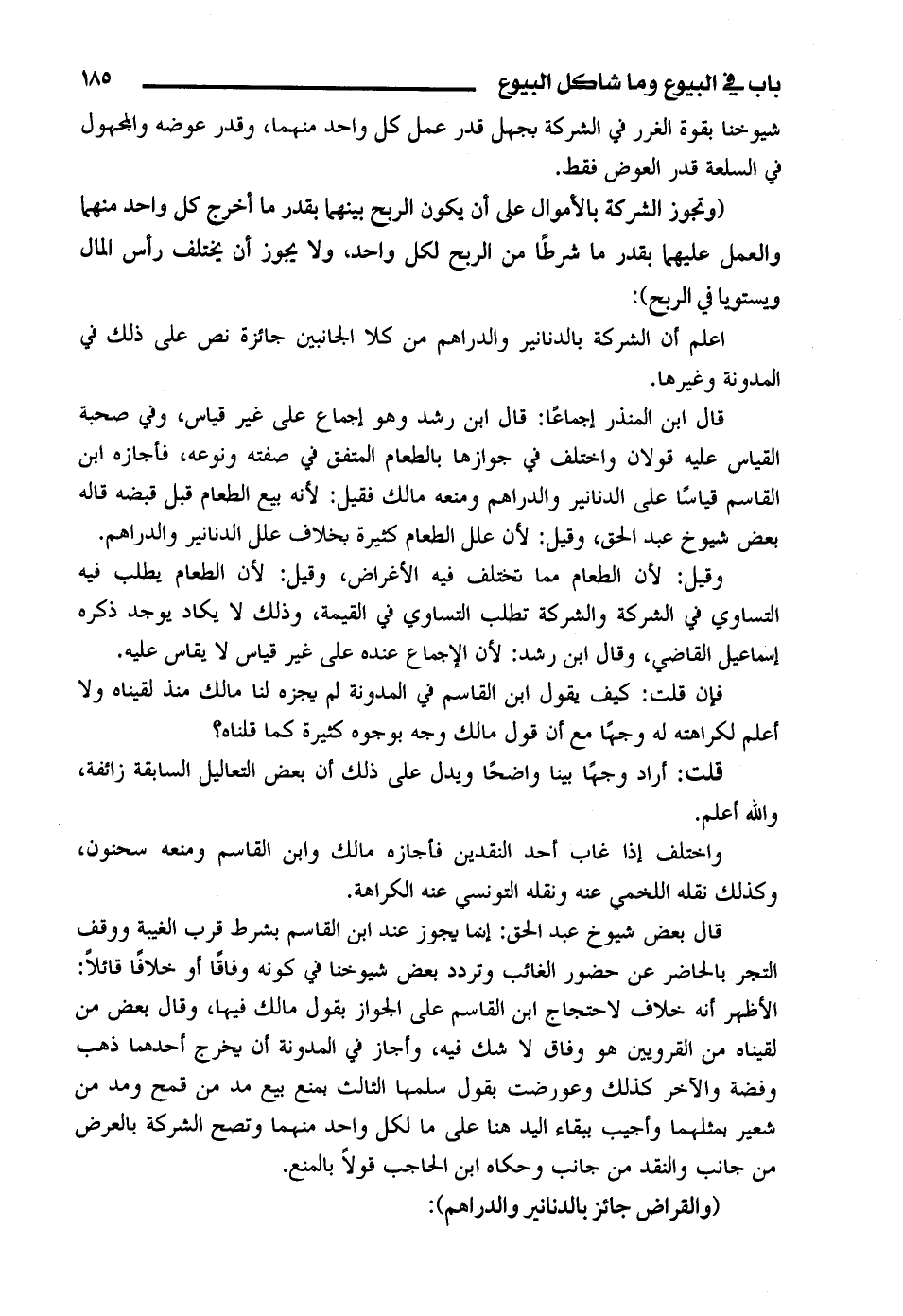 قال بعض شيوخ عبد الحق: إنما يجوز عند ابن القاسم بشرط قرب الغيبة ووقف التجر بالحاضر عن حضور الغائب وتردد بعض شيوخنا في كونه وفاقًا أو خلافًا قائلاً: الأظهر أنه خلاف لاحتجاج ابن القاسم على الجواز بقول مالك فيها، وقال بعض من لقيناه من القروبين هو وفاق لا شك فيه، وأجازه في المدونة أنه يخرج أحدهما ذهب وفضة والآخر كذلك وعورضت بقول سلمها الثالث بمنع بيع مد من قمح ومد من شعير بمثلهما وأجيب ببقاء اليد هنا على ما لكل واحد منهما وتصح الشركة بالعرض من جانب والنقد من جانب وحكاه ابن الحاجب قولاً بالمنع.