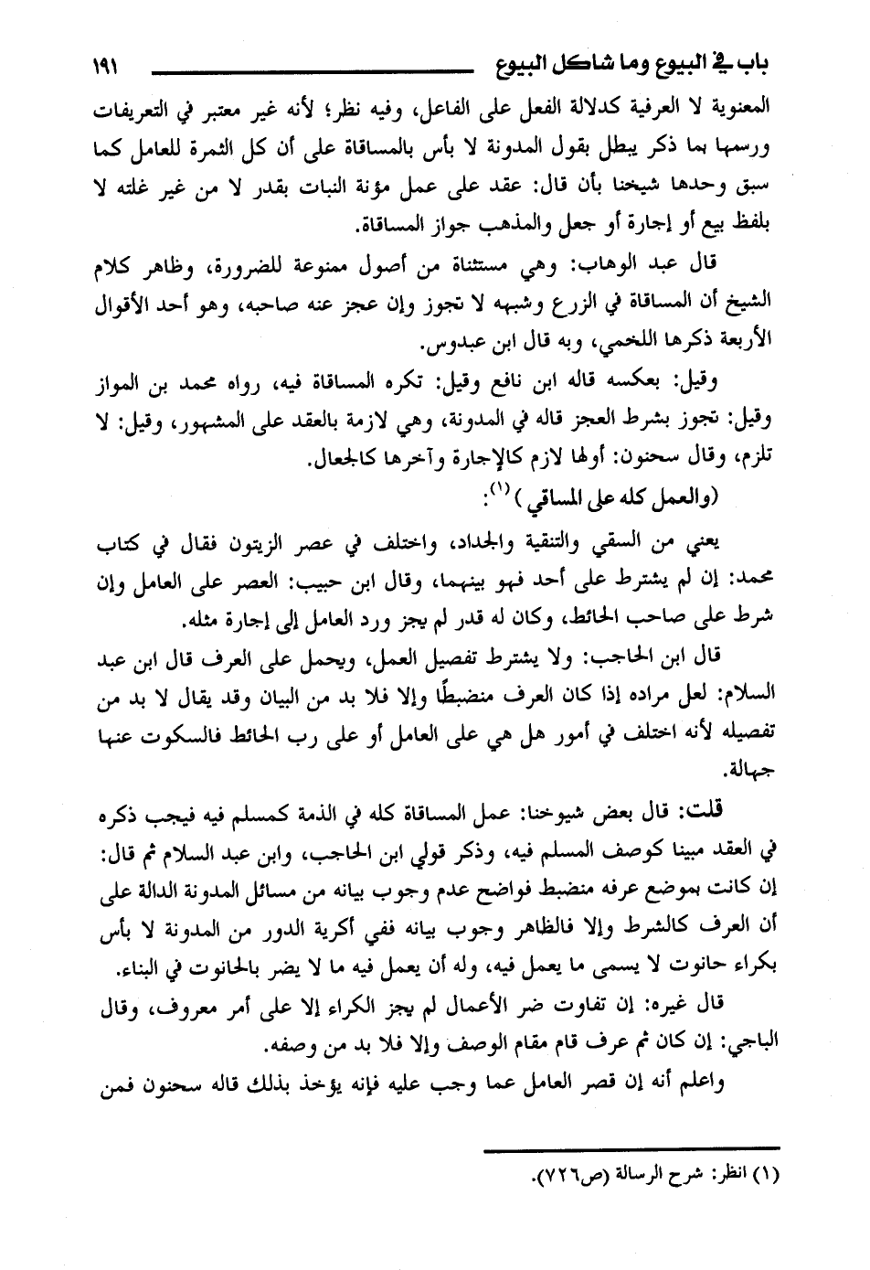 قلت: قال بعض شيوخنا: عمل المساقاة كله في الذمة كمسلم فيه فيجب ذكره في العقد مبينا كوصف المسلم فيه، وذكر قولي ابن الحاجب، وابن عبد السلام ثم قال: إن كانت بموضع عرفه منضبط فواضح عدم وجوب بيانه مسائل المدونة الدالة على أن العرف كالشرط وإلا فالظاهر وجوب بيانه ففي أكرية الدور من المدونة لا بأس بكراء حانوت لا يسمي ما يعمل فيه، وله أن يعمل فيه ما لا يضر بالحانوت في البناء.