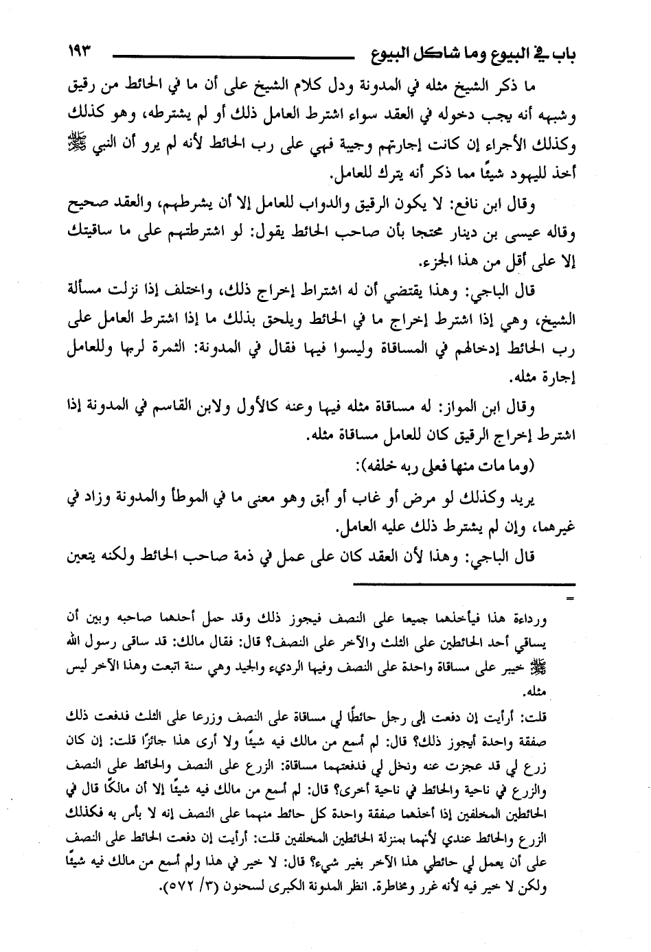 ما ذكر الشيخ مثله في المدونة ودل كلام الشيخ على أن ما في الحائط من رقيق وشبهه أنه يجب دخوله في العقد سواء اشترط العامل ذلك أو لم يشترطه، وهو كذلك وكذلك الأجراء إن كانت إجارتهم وجيبة فهي على رب الحائط لأنه لم يرو أن النبي (صلى الله عليه وسلم) أخذ لليهود شيئا مما ذكر أنه يترك للعامل.